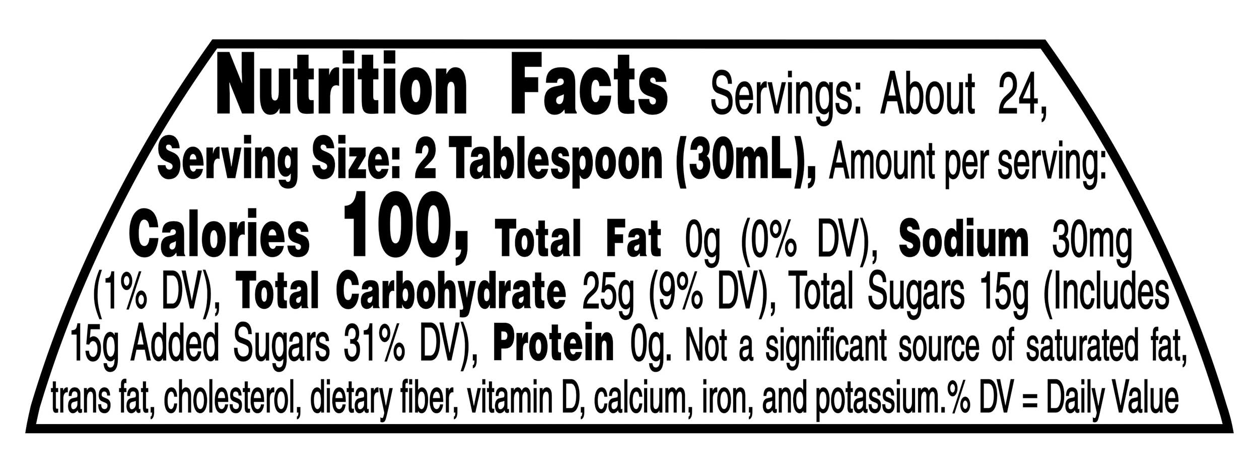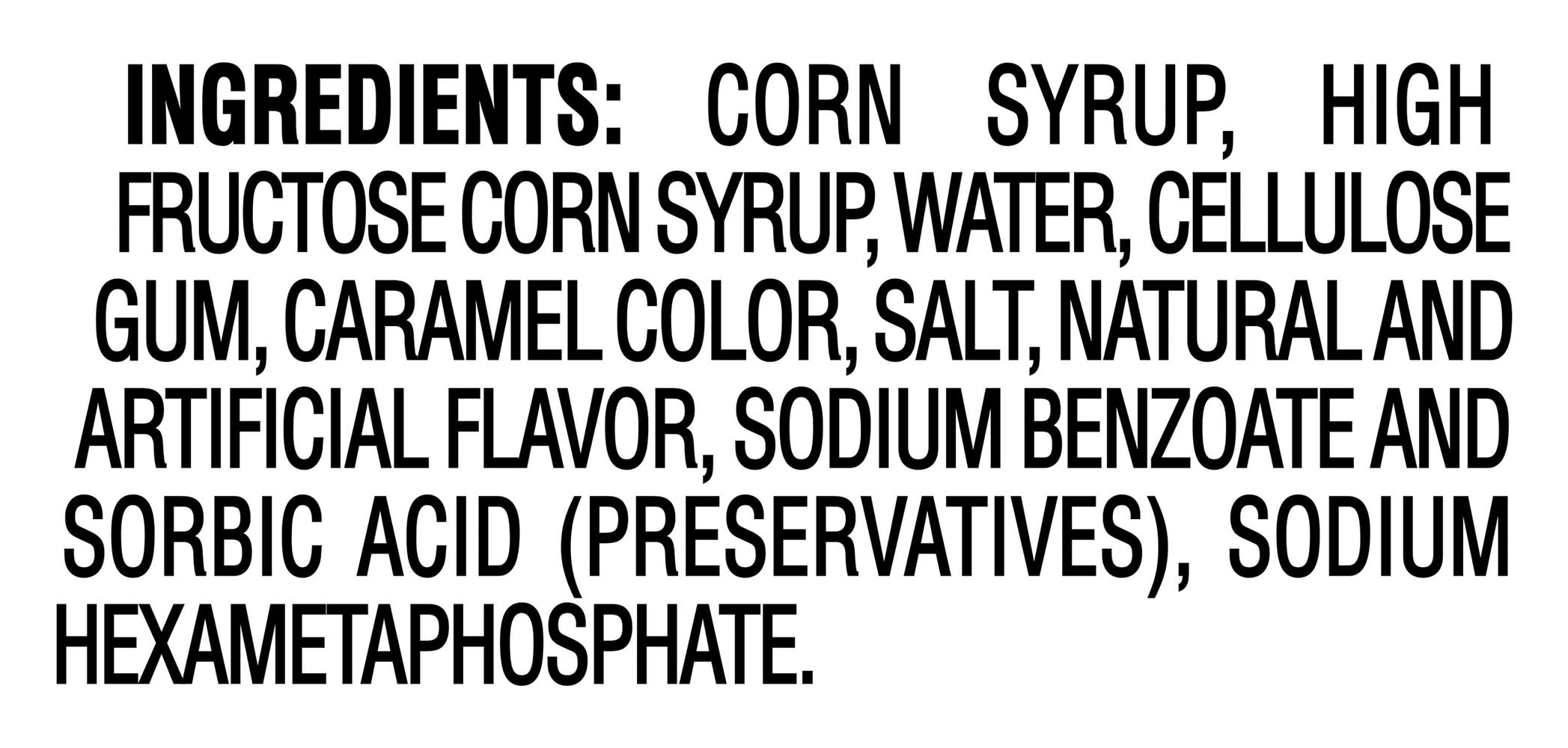 Ingredients: Corn Syrup, High Fructose Corn Syrup, Water, Cellulose Gum, Caramel Color, Salt, Natural and Artificial Flavor, Sodium Benzoate and Sorbic Acid (Preservatives), Sodium Hexametaphosphate Contains: Corn