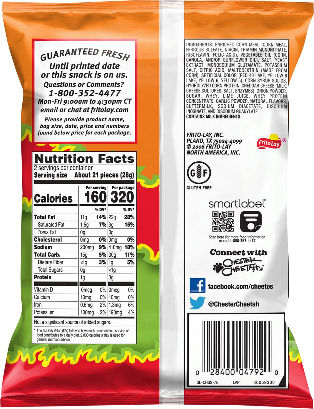Cheese Flavored, Flamin' Hot Limon Flavored • Flavor: Flamin' hot limón cheese • Number of servings: 2 • Frito-Lay, Inc., Plano, TX, 75024-4099, Ph: 800-352-4477