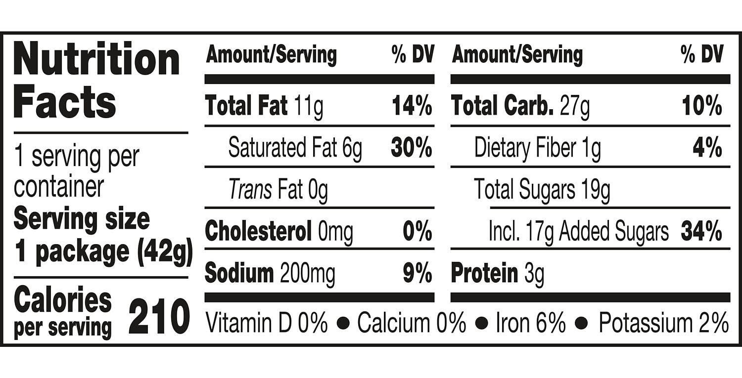 Ingredients: SUGAR, ENRICHED WHEAT FLOUR (FLOUR, NIACIN, FERROUS SULFATE, THIAMIN MONONITRATE, RIBOFLAVIN, FOLIC ACID), VEGETABLE OIL (PALM OIL, SHEA OIL, SUNFLOWER OIL, PALM KERNEL OIL, CANOLA OIL, /OR SAFFLOWER OIL), PEANUTS, HIGH FRUCTOSE CORN SYRUP, LACTOSE (MILK), HYDROGENATED VEGETABLE OIL (PALM KERNEL OIL, COCONUT OIL, SOYBEAN OIL), PARTIALLY DEFATTED PEANUTS, REDUCED PROTEIN WHEY (MILK), SKIM MILK, CONTAINS 2% OR LESS OF: CHOCOLATE, DEXTROSE, COCOA PROCESSED WITH ALKALI, COCOA, SALT, CORN SYRUP SOLIDS, DAIRY BUTTER (MILK), GLYCERIN, CORN SYRUP, LECITHIN (SOY), MONO- AND DIGLYCERIDES, ARTIFICIAL FLAVOR, BAKING SODA, CARRAGEENAN, MILK FAT, YEAST, TBHQ CITRIC ACID (TO MAINTAIN FRESHNESS), DISODIUM PHOSPHATE. Contains: Wheat., Peanuts, Corn, Soybeans, Milk
