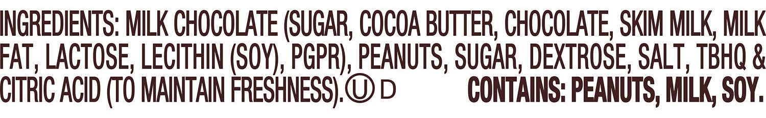 Ingredients: MILK CHOCOLATE, SUGAR, COCOA BUTTER, CHOCOLATE, SKIM MILK, MILK FAT, LACTOSE, LECITHIN (SOY), PGPR, PEANUTS, SUGAR, DEXTROSE, SALT, TBHQ CITRIC ACID (TO MAINTAIN FRESHNESS), . Contains: Contains: Peanuts|Soy|Milk