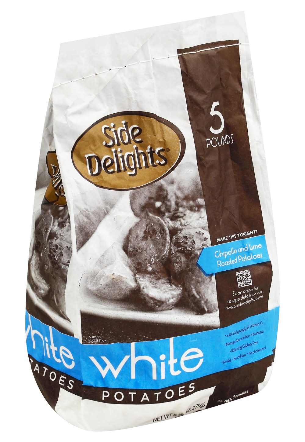 45% daily supply of vitamin C. More potassium than a banana. Naturally gluten-free. No fat - No sodium - No cholesterol. US No. 1 potatoes. Make this tonight! Chipotle and lime roasted potatoes. Scan code for recipe details or visit www.sidedlights.com. Potatoes goodness unearthed. Naturally fat free. Full of vitamins and minerals. www.sidedelights.com. Produce of USA.