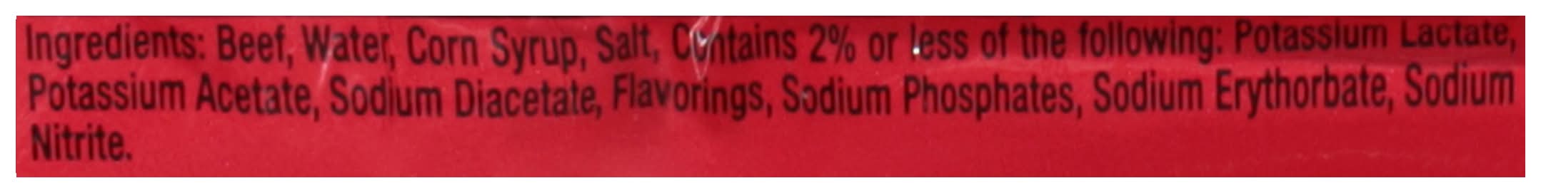 Ingredients: Beef, Water, Corn Syrup, Salt, Contains 2% or Less of the Following: Potassium Lactate, Potassium Acetate, Sodium Diacetate, Flavorings, Sodium Phosphates, Sodium Erythorbate, Sodium Nitrite
