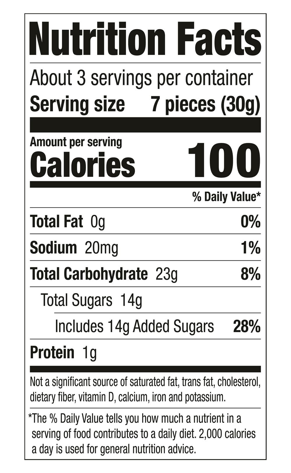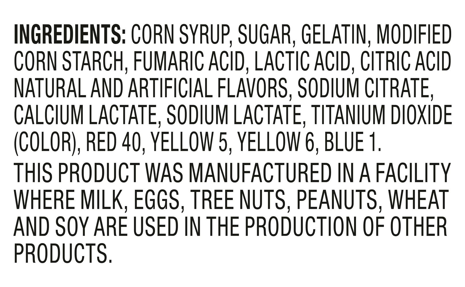 Ingredients: Corn Syrup, Sugar, Gelatin, Modified Corn Starch, Fumaric Acid, Lactic Acid, Citric Acid, Natural and Artificial Flavors, Sodium Citrate, Calcium Lactate, Sodium Lactate, Titanium Dioxide (Color), Red 40, Yellow 5, Yellow 6, Blue 1 Contains: Milk, Eggs, Tree Nuts, Peanuts, Wheat, Soybeans