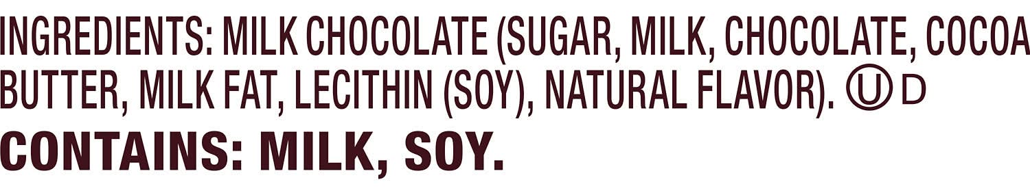 Ingredients: MILK CHOCOLATE, SUGAR, MILK, CHOCOLATE, COCOA BUTTER, MILK FAT, LECITHIN (SOY), NATURAL FLAVOR, . Contains: Contains: Soy|Milk