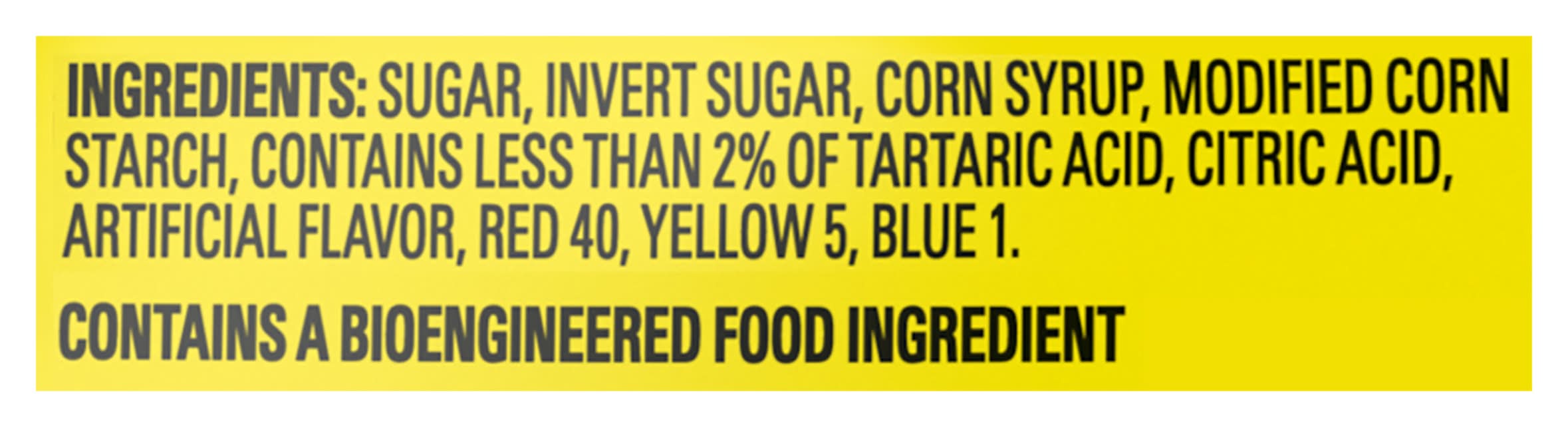 Ingredients: INGREDIENTS: SUGAR, INVERT SUGAR, CORN SYRUP, MODIFIED CORN STARCH, CONTAINS LESS THAN 2% OF TARTARIC ACID, CITRIC ACID, ARTIFICIAL FLAVOR, RED 40, YELLOW 5, BLUE 1. Contains: Corn
