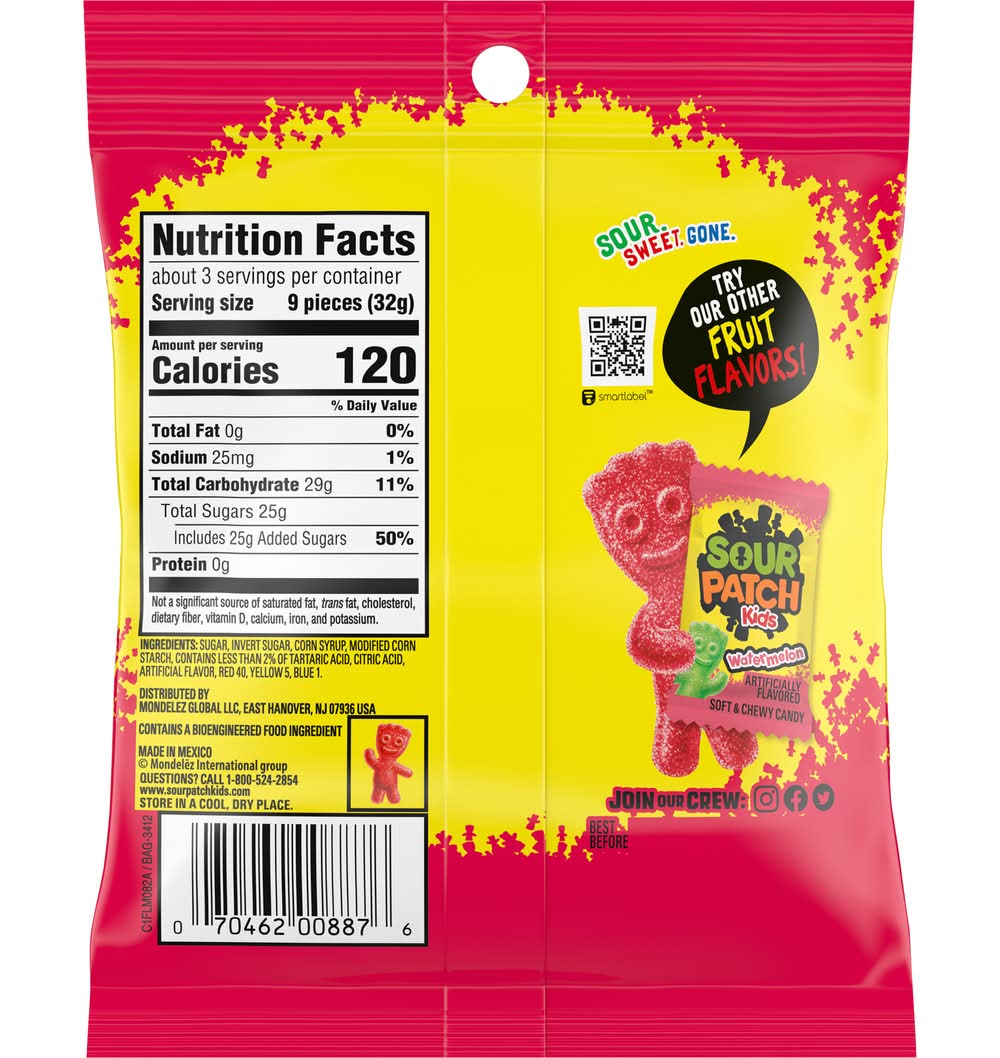 SOUR PATCH KIDS Strawberry Soft and Chewy Candy tempts your taste buds with a twist on a classic flavor. These deliciously juicy fruit-shaped chewy candies are sweet and fruity, with just a little bit of sour. The fun strawberry shape adds excitement to your snacking and is the perfect summery addition to snack bowls. This sour candy is the perfect SOUR THEN SWEET treat end to your day, and it's a fun soft candy to serve at birthday parties, holiday celebrations and game nights. SOUR PATCH KIDS strawberry candy also makes a great movie theater candy to snack on during your favorite flick. Each bag of these sour gummy snacks is sealed to ensure each piece stays soft, chewy and full of strawberry flavor.