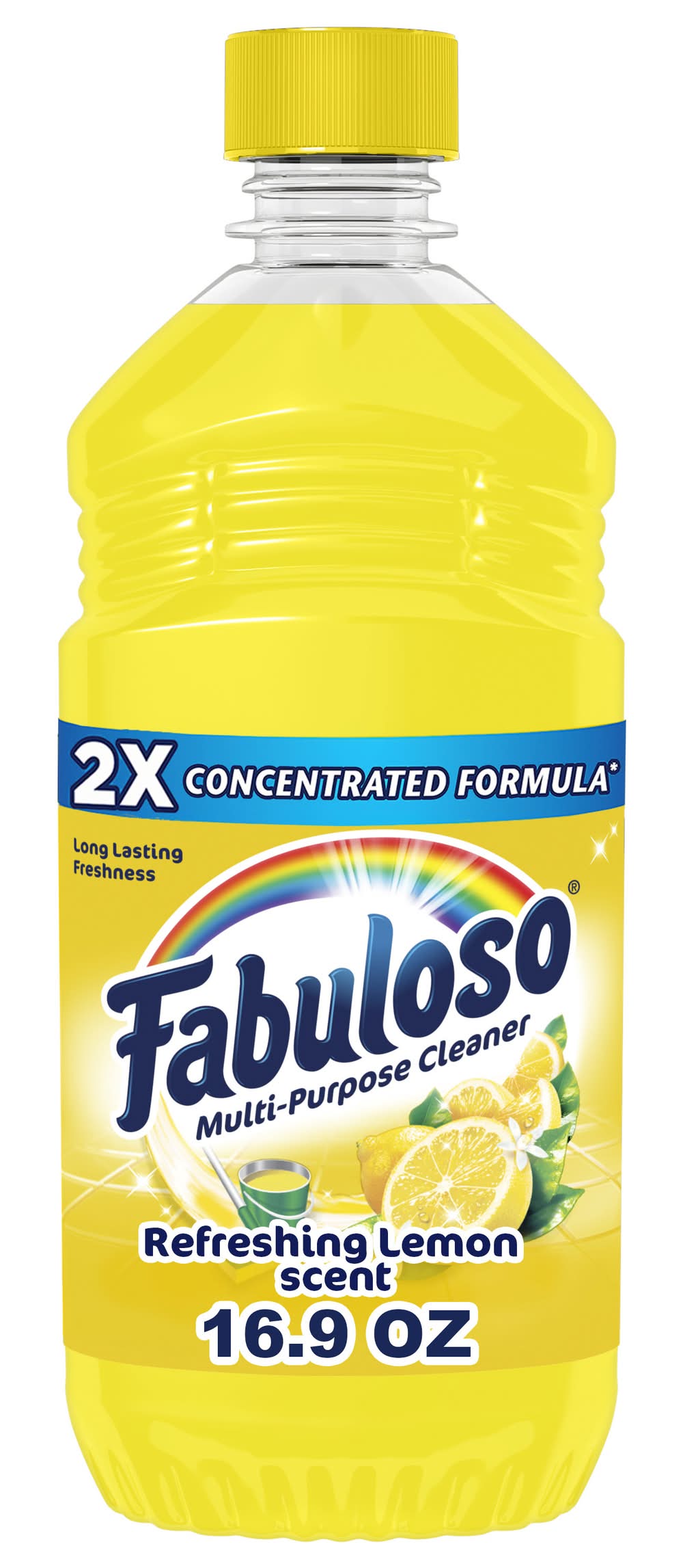 Fabuloso® Multi-Purpose Cleaner, 2X Concentrated Formula, Refreshing Lemon Scent Fabuloso® Multi-Purpose Cleaner, 2X Concentrated Formula in Refreshing Lemon Scent transforms your home with a fresh scent that lasts. Bring the fragrance of lemon indoors, and experience a warm, joyful feeling your friends and family will love. Fabuloso®’s 2X Concentrated Formula now provides 2X more active ingredients compared to non-concentrated Fabuloso Original, giving you 2X the dosage in the same bottle. Every colorful pour from the easy-pour bottle delivers a long-lasting, unmistakable freshness and leaves your home bright and clean. Use Fabuloso® Multi-Purpose Cleaner, on sinks, toilets, tubs, showers, kitchen and bathroom floors, sealed wood surfaces, appliances, counters, windows, mirrors, walls, doorknobs and furniture, and fill every room in your home with joy. Uplifting fragrances. Clean surfaces. Irresistible joy. Life isn’t always easy, but cleaning it up sure can be. Fabuloso® combines cleaning power with fresh scents that fill your home with joy, to make it a welcoming place no matter how hard your day. Fabuloso®’s 2X Concentrated Formula provides 2X more uses in the same bottle compared to non-concentrated Fabuloso Original. From the kitchen to the bathroom and beyond, Fabuloso® Multi-Purpose, Cleaner 2X Concentrated has a wide variety of long-lasting fragrances that deliver hope for a better tomorrow. Try all of our uplifting scents: Lavender, Passion of Fruits, Citrus & Fruits with Baking Soda, Bleach Alternative† Spring Fresh, Tropical Spring, and Orange Scent with Baking Soda. † Bleach-free option with 20% more active ingredients vs other Fabuloso 2X Concentrated products Shared Moments of Joy All Over the World Our story begins in Venezuela, circa 1980. Cleaning products lacked fragrance and distinction. But families wanted lasting scents that kept their homes fresh and clean for hours. Enter the bold colors and joyful fragrances of Fabuloso® ! 16 years later, families across America also got to experience the joy: we became a household staple thanks to our rainbow of colors and playful, distinctive scents. Today, across the world, we’re more than cleaning products. We’re a catalyst for joy.