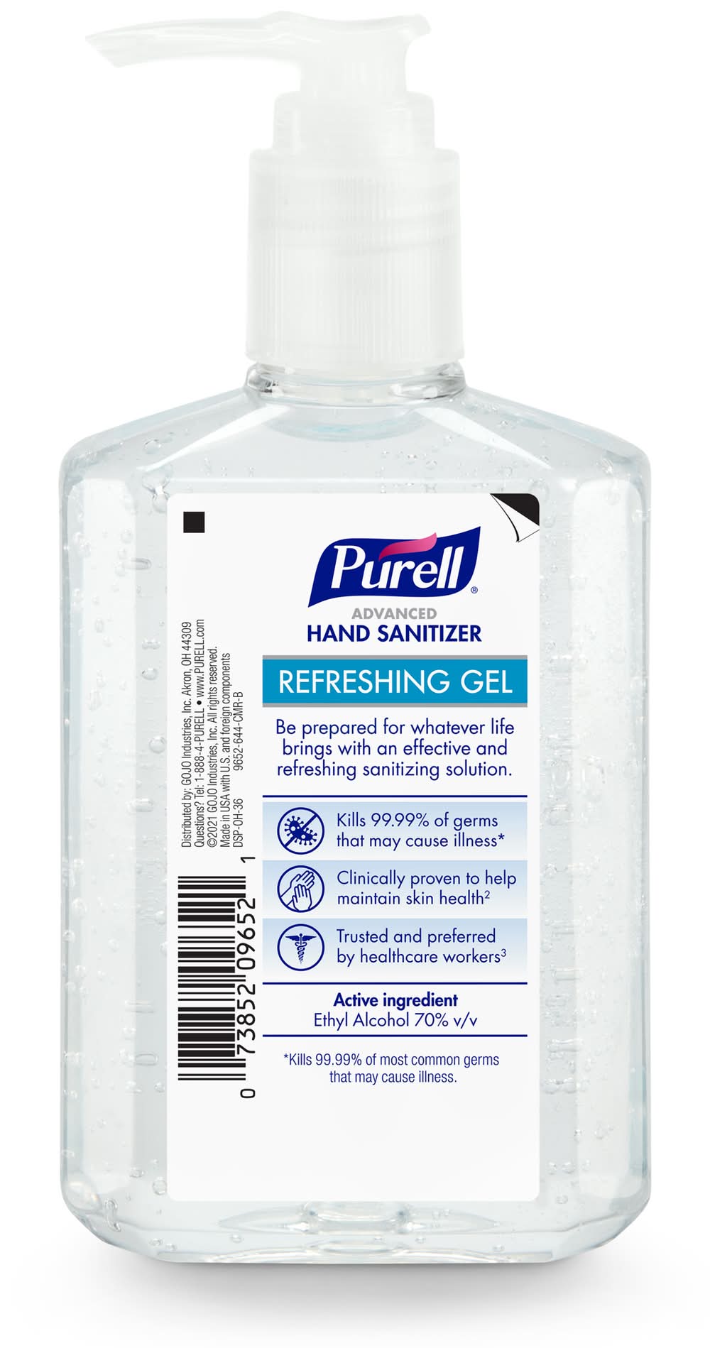 Purell Advanced Hand Sanitizer is formulated to effectively kill 99.99% of most common germs that may cause illness. With a formula designed to be twice as effective as a single squirt of some other national brands, it requires only a small amount to achieve its sanitizing strength. In addition to its germ-killing capabilities, it is also crafted to leave hands feeling soft after use. This product is manufactured in the United States. • Gojo Industries, Inc., Akron, OH, 44309, • Packaging: Reusable