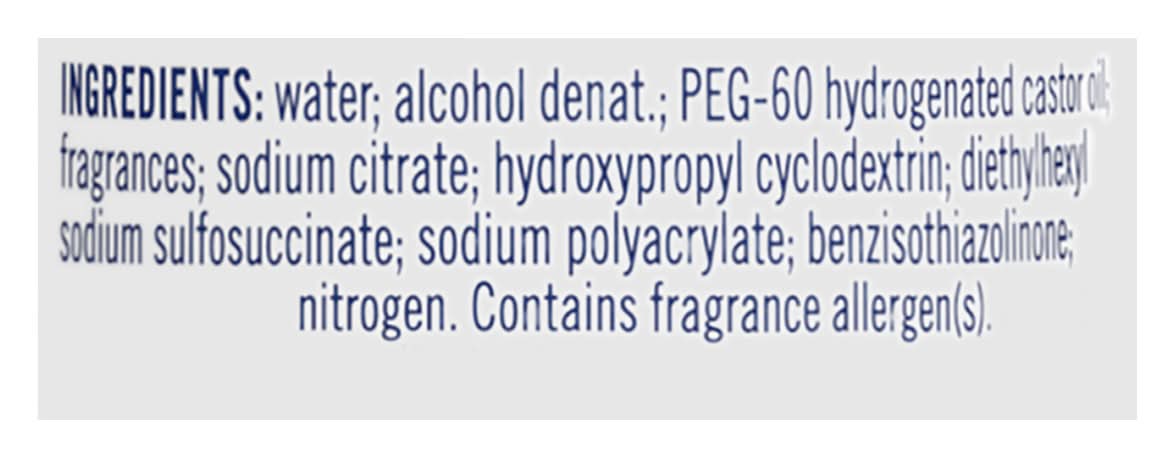 Ingredients: Water; Alcohol Denat.; PEG-60 Hydrogenated Castor Oil; Fragrances; Sodium Citrate; Hydroxypropyl Cyclodextrin; Diethylhexyl Sodium Sulfosuccinate; Sodium Polyacrylate; Benzisothiazolinone; Nitrogen