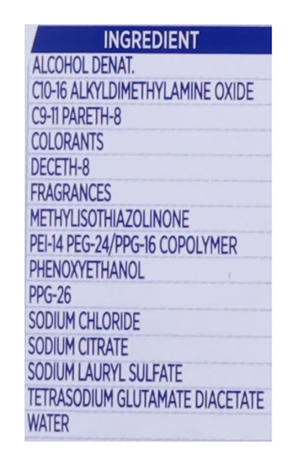 Ingredients: Alcohol Denatured, C10-16 Alkyldimethylamine Oxide, C9-11 Pareth-8, Colorants, Deceth-8, Fragrances, Methylisothiazolinone, PEI-14 PEG-24/PPG-16 Copolymer,, Phenoxyethanol, PPG-26, Sodium Chloride, Sodium Citrate, Sodium Lauryl Sulfate, Tetrasodium Glutamate Diacetate, Water