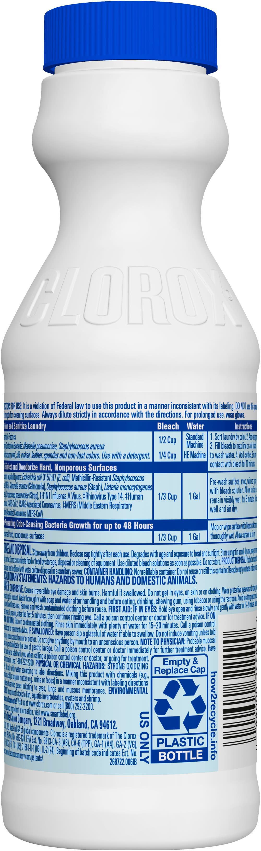 Directions for use: Directions for Use: It is violation of federal law to use this product in a manner inconsistent with its labeling. Do not use this product full strength for cleaning surfaces. Always dilute strictly in accordance with the directions. For prolonged use, wear gloves. Four Laundry: Bleachable Fabrics: Avoid bleaching wool, silk, mohair, leather, spandex and nonfast colors. Bleach: 1/3 cup (whitening). Water: Standard machine or HE machine. Instructions: 1. Sort laundry by color. 2. Add detergent. 3. Fill bleach to max line in dispenser or add measured amount of bleach to wash water. 4. Add clothes and start wash. Ensure contact with bleach for 10 minutes. For Laundry: Laundry Sanitization Organisms: Klebsiella pneumoniae, staphylococcus aureus. Bleach: 1/2 cup (sanitizing). Water: Standard machine. Instructions: 1. Sort laundry by color. 2. Add detergent. 3. Fill bleach to max line in dispenser or add measured amount of bleach to wash water. 4. Add clothes and start wash. Ensure contact with bleach for 10 minutes. For General Disinfection and Deodorizing Hard, Nonporous Surfaces: Floors, walls, vinyl, glazed tile, bathtubs, showers, sinks and hard, nonporous toys. Bleach: 1/3 cup. Water: 1 gallon. Instructions: Prewash surface. Mop or wipe with bleach solution. Allow solution to contact surface for at least 6 minutes. Rinse well and air dry. Storage recommendation: Storage and Disposal: Store away from children. Reclose cap tightly after each use. Degrades with age and exposure to heat and sunlight. Store upright in a cool, dry area, away from direct sunlight and heat. Do not contaminate food or feed by storage, disposal or cleaning of equipment. Product Disposal: Product or rinsates that cannot be used must be diluted with water before disposal in a sanitary sewer. Container Handling: Nonrefillable container. Do not reuse or refill this container. Recycle empty container or discard in trash.