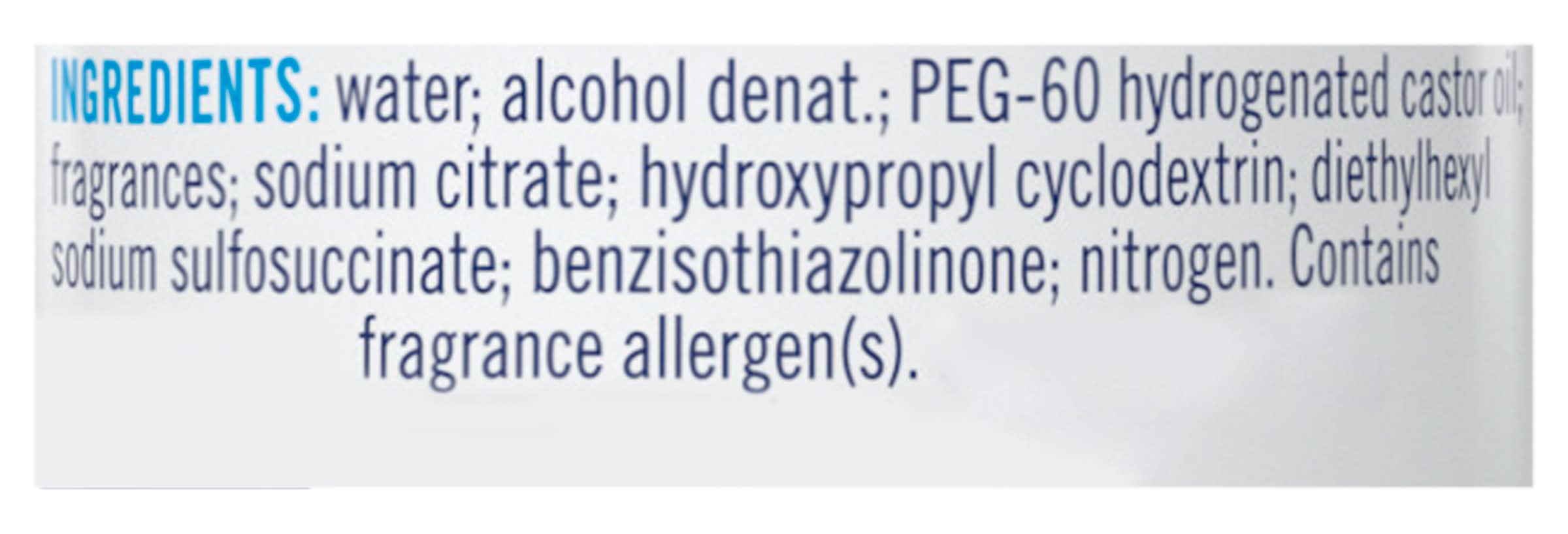 Ingredients: Water, Alcohol Denatured, PEG-60 Hydrogenated Castor Oil, Fragrances, Sodium Citrate, Hydroxypropyl Cyclodextrin, Diethylhexyl Sodium Sulfosuccinate, Benzisothiazolinone, Nitrogen Water, Alcohol Denat, PEG-60 Hydrogenated Castor Oil, Fragrances, Sodium Citrate, Hydroxypropyl Cyclodextrin, Diethylhexyl Sodium Sulfosuccinate, Benzisothiazolinone, Nitrogen
