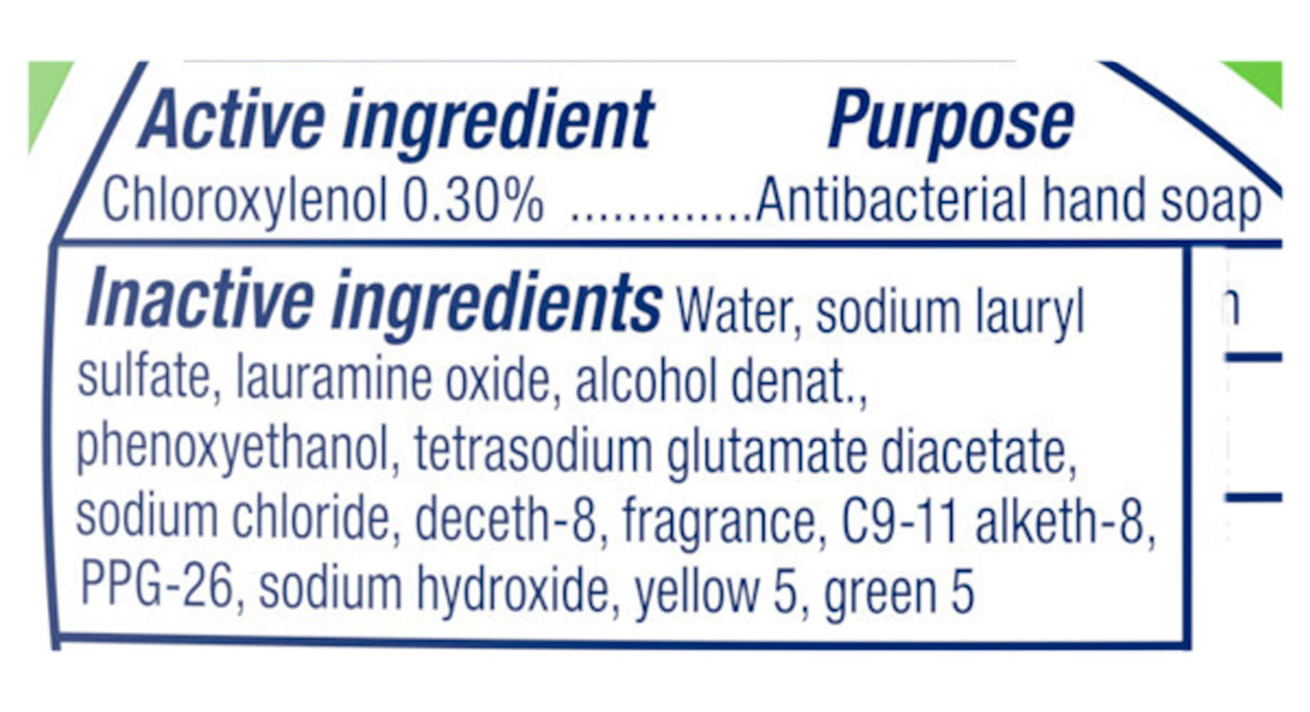 Ingredients: Active Ingredients: Chloroxylenol (0.30 %), Antibacterial Hand Soap. Inactive Ingredients: Water, Sodium Lauryl Sulfate, Lauramine Oxide, Alcohol Denat, Phenoxyethanol, Tetrasodium Glutamate Diacetate, Sodium Chloride, Deceth-8, Fragrance, C9-11 Alketh-8, PPG-26, Sodium Hydroxide, Yellow 5, Green 5