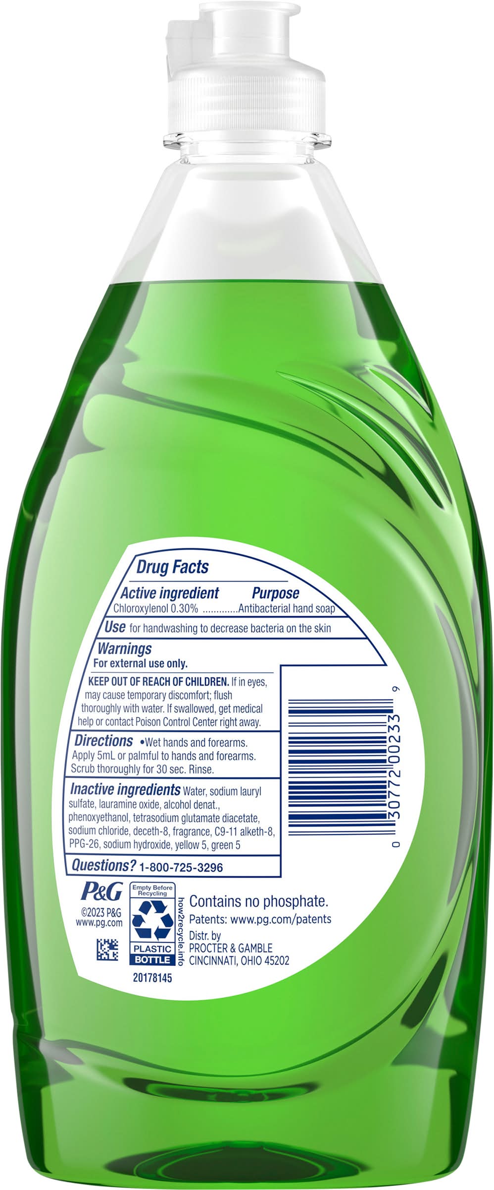 Chloroxylenol antibacterial hand soap. 50% less scrubbing (vs Dawn non-concentrated). Time to refill. Contains no phosphate
