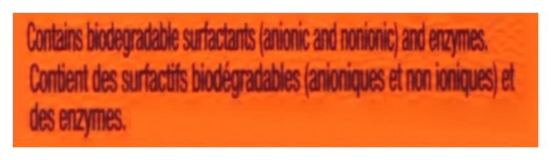 Ingredients: Made with: Sodium Lauryl Sulfate, C10-16 Pareth, Sodium and MEA C10-16 Alkylbenzenesulfonate, MEA Laureth Sulfate, Sodium Borate, Hydrogenated Castor Oil, Sodium Bisulfite, Calcium Formate, Sodium Cumenesulfonate, Sodium and MEA Salts of C12-18 Fatty Acids, Sodium and MEA Citrate, Subtilisin, Amylase Enzyme, Mannanase Enzyme, Cellulase Enzyme, Polyethyleneimine Alkoxylates, Tetrasodium Glutamate Diacetate, Diethylenetriamine, Methyl Di-T-Butyl Hydroxyhydrocinnamate, Propylene Glycol Alcohol, Ethanolamine, Colorants, Fragrances, Water/Eau