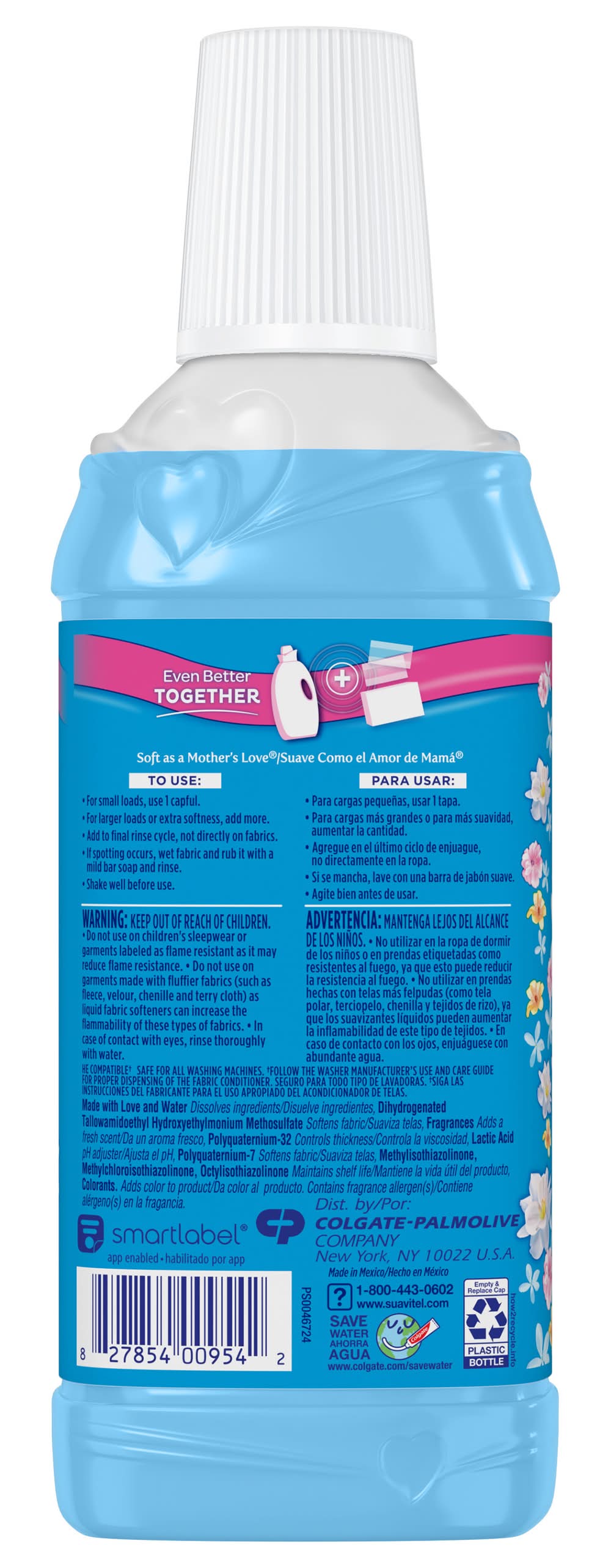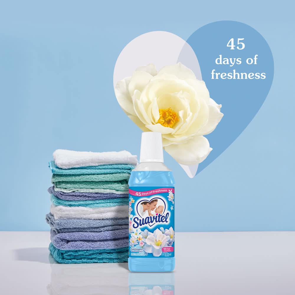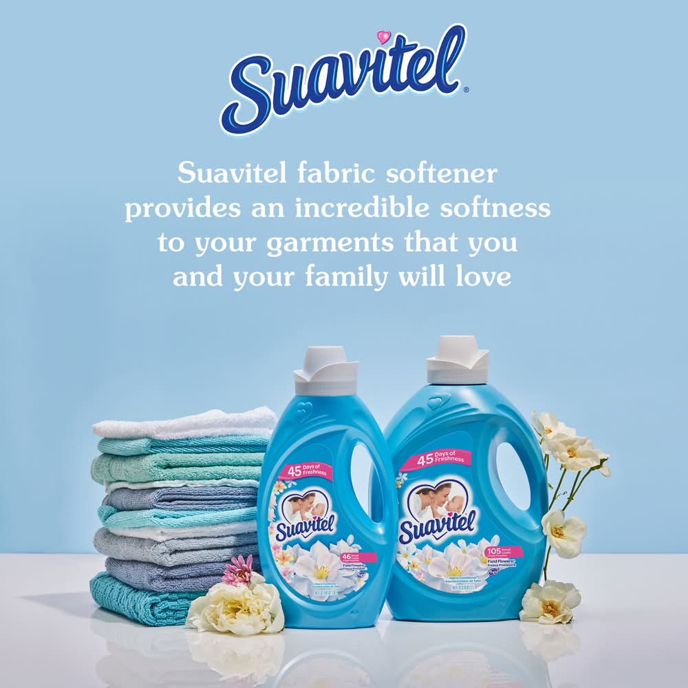 Suavitel’s new formula has more softening ingredients per ounce versus the previous formula, providing a softness that you and your family will love. Embrace the ultimate comfort that Suavitel fabric softener provides. Suavitel fabric softener not only leaves your laundry incredibly soft but also imparts a delightful fragrance that lasts for up to 45 days. Enjoy the uplifting and refreshing scent of Field Flowers, bringing the essence of a blooming garden to your clothes and linens. Immerse yourself in the enchanting aroma of Field Flowers and revel in the softness that Suavitel laundry softener provides. The irresistible fragrance and incredible softness will transform your laundry routine into a delightful experience (1). Suavitel is compatible with all types of washing machines, including HE Washing Machines. You can trust Suavitel to deliver outstanding results without causing any damage to your laundry appliances. Upgrade your laundry routine with Suavitel Fabric Softener Field Flowers. Experience the benefits of a new formula, more softening ingredients (2), and a lower dosing amount than the prior Suavitel formula. Revel in the captivating fragrance, incredible softness, and long-lasting freshness that Suavitel provides, and enjoy the confidence of beautifully cared-for clothes. (1) Follow the washer manufacturer's use and care guide for proper dispensing of the fabric conditioner (2) Per ounce vs. previous formula