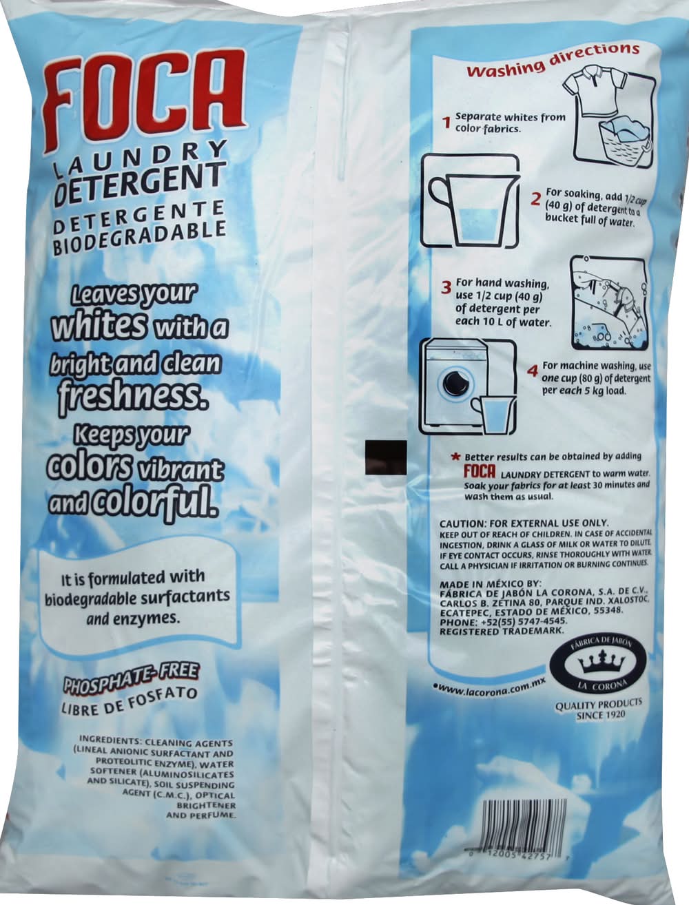 Washing: 1. separate whites from color fabrics. 2. for soaking, add 1/2 cup (40 g) of detergent to a bucket full of water. 3. for hand washing, use 1/2 cup (40 g) of detergent per each 10 lt of water. 4. for washing machine, use one cup (80 g) of detergent per each 5 kg load. better results can be obtained by adding foca laundry detergent to warm water. soak your fabrics for at least 30 minutes and wash them as usual.