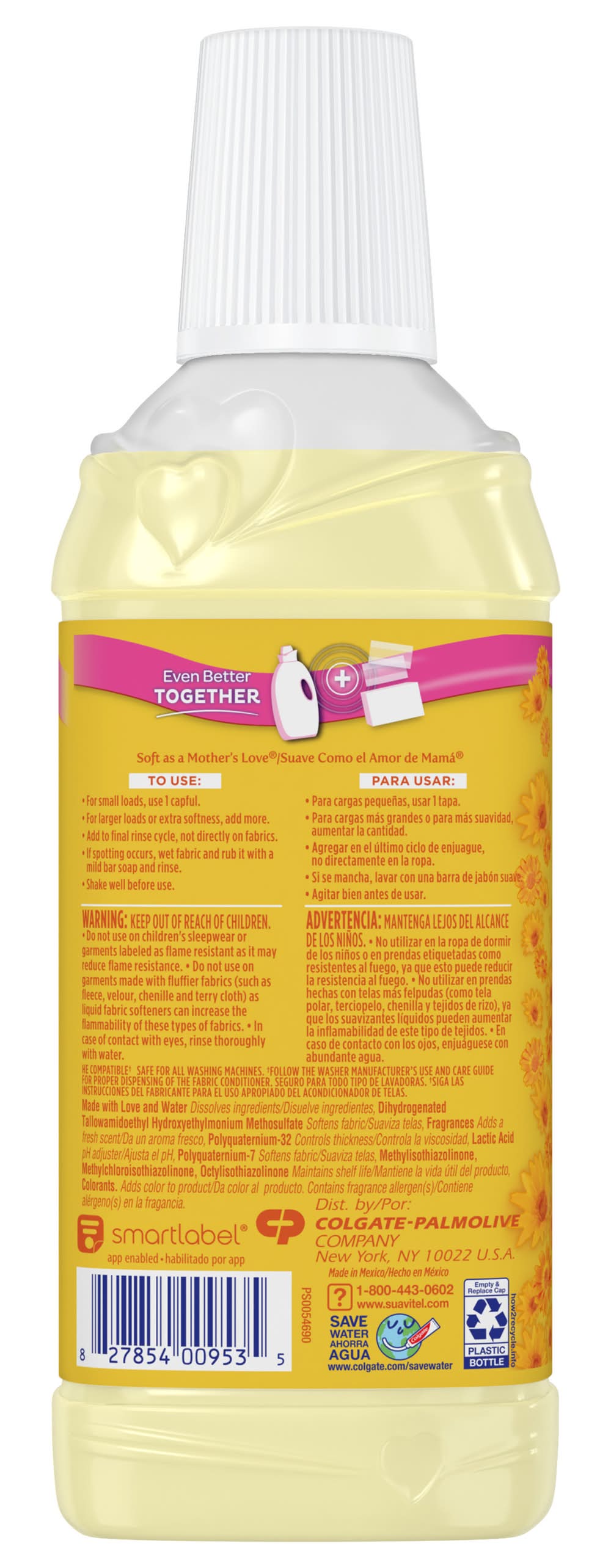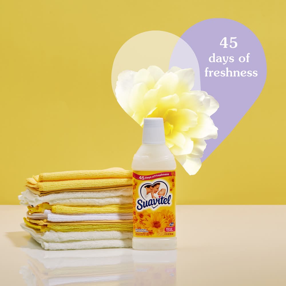 Suavitel’s new formula has more softening ingredients per ounce versus the previous formula, providing a softness that you and your family will love. Embrace the ultimate comfort that Suavitel fabric softener provides. Suavitel fabric softener not only leaves your laundry incredibly soft but also imparts a delightful fragrance that lasts for up to 45 days. Enjoy the light, fresh scent of a bright summer morning with every wash and revel in the softness that Suavitel fabric softener provides to your clothes and linens. The irresistible fragrance and incredible softness will transform your laundry routine into a delightful experience (1). Suavitel is compatible with all types of washing machines, including HE Washing Machines. You can trust Suavitel to deliver outstanding results without causing any damage to your laundry appliances. Upgrade your laundry routine with Suavitel Fabric Softener Morning Sun. Experience the benefits of a new formula, more softening ingredients (2), and a lower dosing amount than the prior Suavitel formula. Revel in the captivating fragrance, incredible softness, and long-lasting freshness that Suavitel provides, and enjoy the confidence of beautifully cared-for clothes. (1) Follow the washer manufacturer's use and care guide for proper dispensing of the fabric conditioner (2) Per ounce vs. previous formula