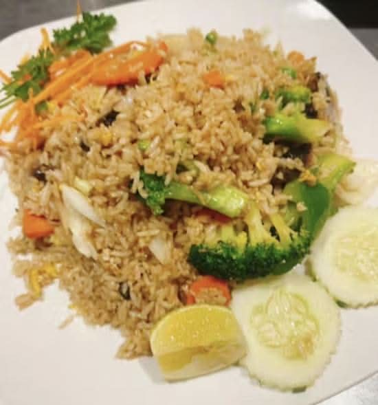 Stir-fried rice, egg, white onions, tomatoes, carrots, and green peas with brown sauce. Made with your choice of protein.