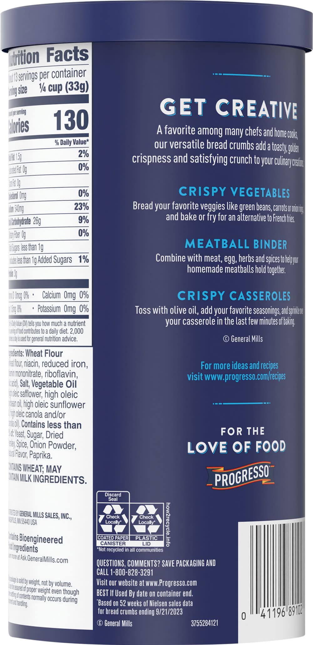 A favorite among many chefs and home cooks, our versatile bread crumbs add a toasty, golden crispness and satisfying crunch to your culinary creations. Crispy Vegetables: Bread your favorite veggies like green beans, carrots or onion rings, and bake or fry for an alternative to French fries. Meatball Binder: Combine with meat, egg, herbs and spices to help your homemade meatballs hold together. Crispy Casseroles: Toss with olive oil, and your favorite seasonings, and sprinkle ever your casserole in the last few minutes of baking. • Flavor: Italian style • Size: 12 units • General Mills Sales, Inc., Minneapolis,MN,55440 • Packaging: Reusable