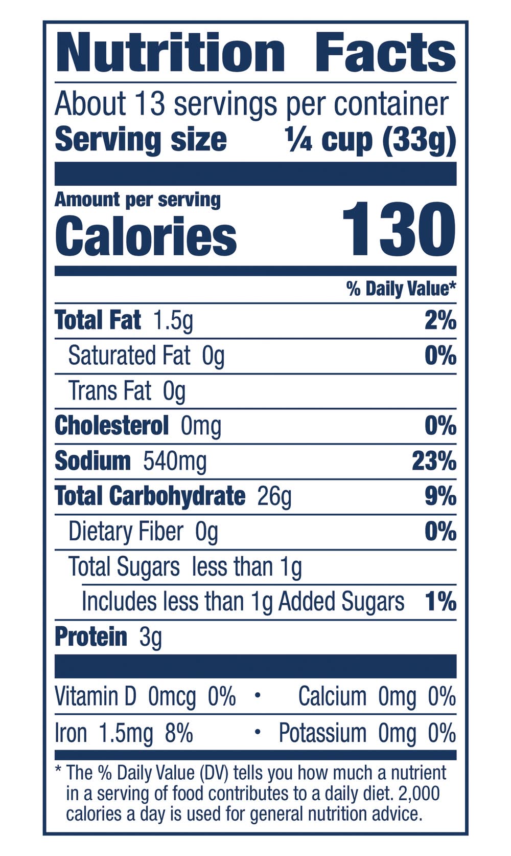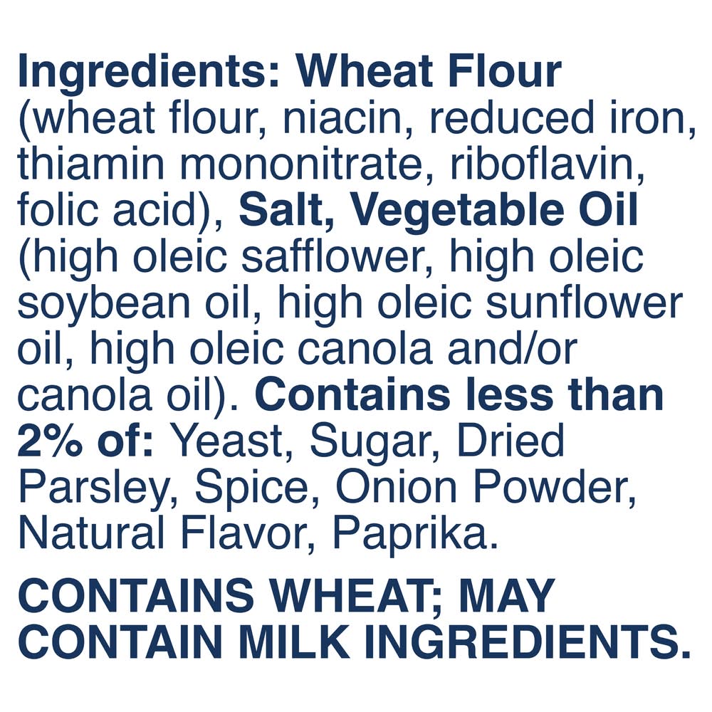 Ingredients: Wheat Flour (Wheat Flour, Niacin, Reduced Iron, Thiamin Mononitrate, Riboflavin, Folic Acid), Salt, Vegetable Oil (High Oleic Safflower, High Oleic Soybean Oil, High Oleic Sunflower Oil, High Oleic Canola and/or Canola Oil), Contains Less than 2% of: Yeast, Sugar, Dried Parsley, Spice, Onion Powder, Natural Flavor, Paprika Contains: Wheat, Milk, Eggs, Soybeans, Sesame