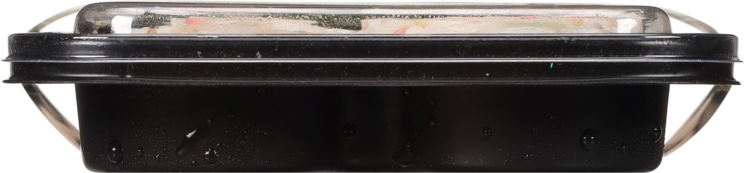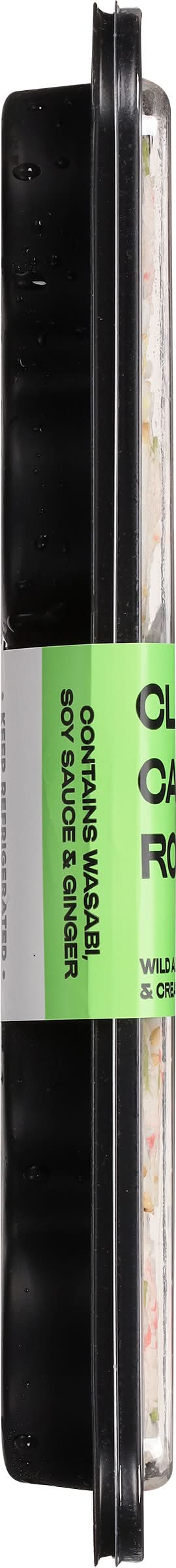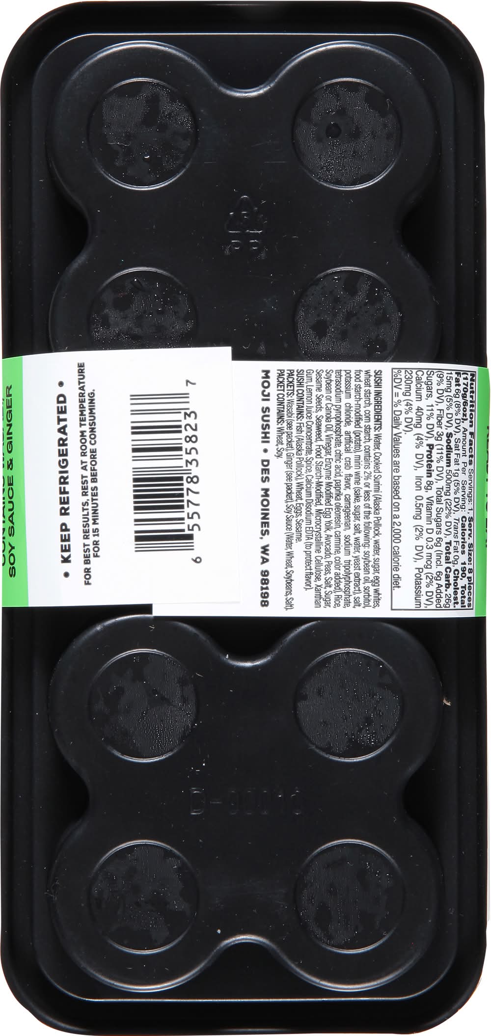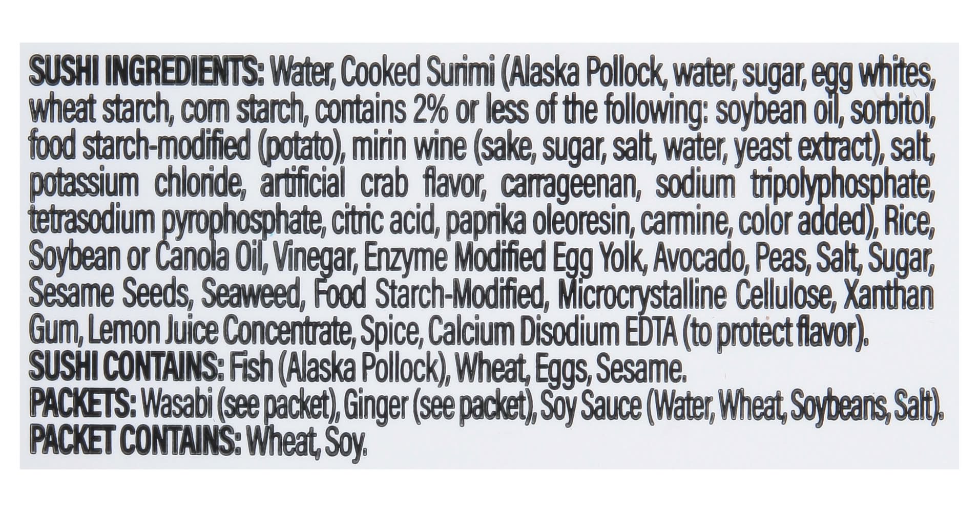 Ingredients: Sushi Ingredients: Water, Cooked Surimi (Alaska Pollock, Water, Sugar, Egg Whites, Wheat Starch, Corn Starch, Contains 2% or Less of the Following: Soybean Oil, Sorbitol, Food Starch-Modified (Potato), Mirin Wine (Sake, Sugar, Salt, Water, Yeast Extract), Salt, Potassium Chloride, Artificial Crab Flavor, Carrageenan, Sodium Tripolyphosphate, Tetrasodium Pyrophosphate, Citric Acid, Paprika Oleoresin, Carmine, Color Added), Rice, Soybean or Canola Oil, Vinegar, Enzyme Modified Egg Yolk, Avocado, Peas, Salt, Sugar, Sesame Seeds, Seaweed, Food Starch-Modified, Microcrystalline Cellulose, Xanthan Gum, Lemon Juice Concentrate, Spice, Calcium Disodium EDTA (to Protect Flavor) Contains: Fish, Pollock, Eggs, Wheat, Corn, Soybeans, Crustacean Shellfish, Crab, Sesame, Fish