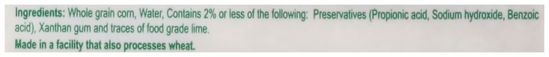 Ingredients: Whole Grain Corn, Water, Contains 2% or Less of the Following: Preservatives (Propionic Acid, Sodium Hydroxide, Benzoic Acid), Xanthan Gum and Traces of Food Grade Lime Contains: Corn, Wheat
