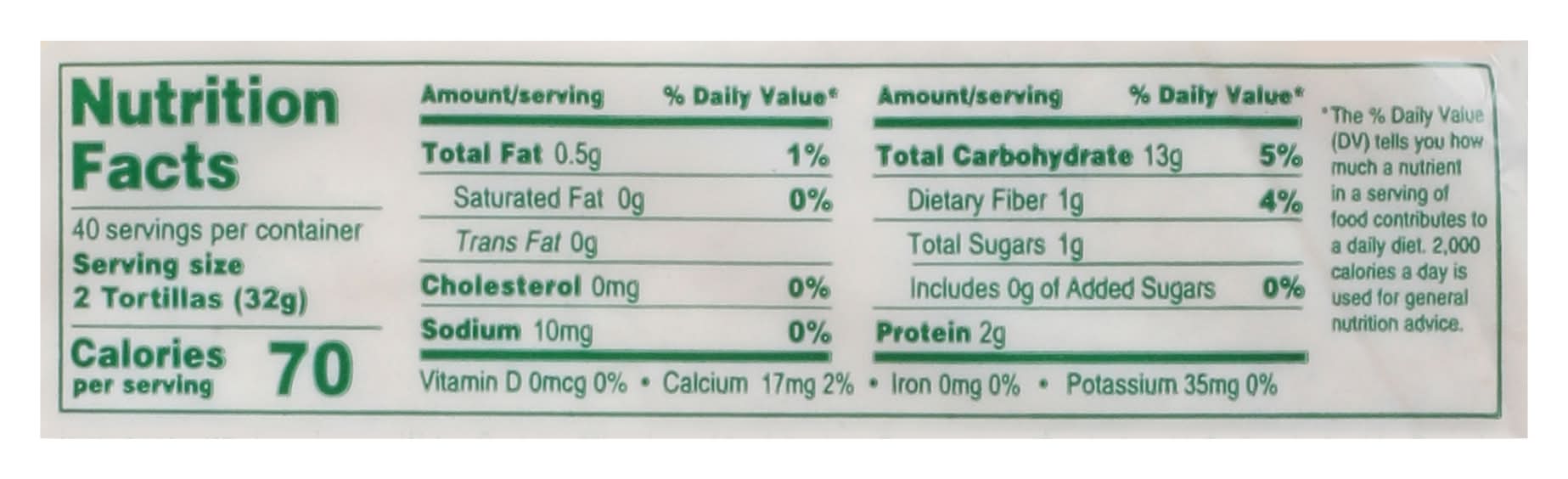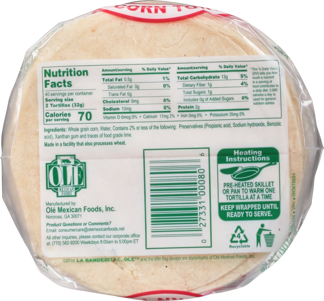 White Corn Tortillas, Mini Taco • Size: 6 units • Number of servings: 40 • Ole Mexican Foods, Inc., Norcross, GA, 30071 • Packaging: Reusable