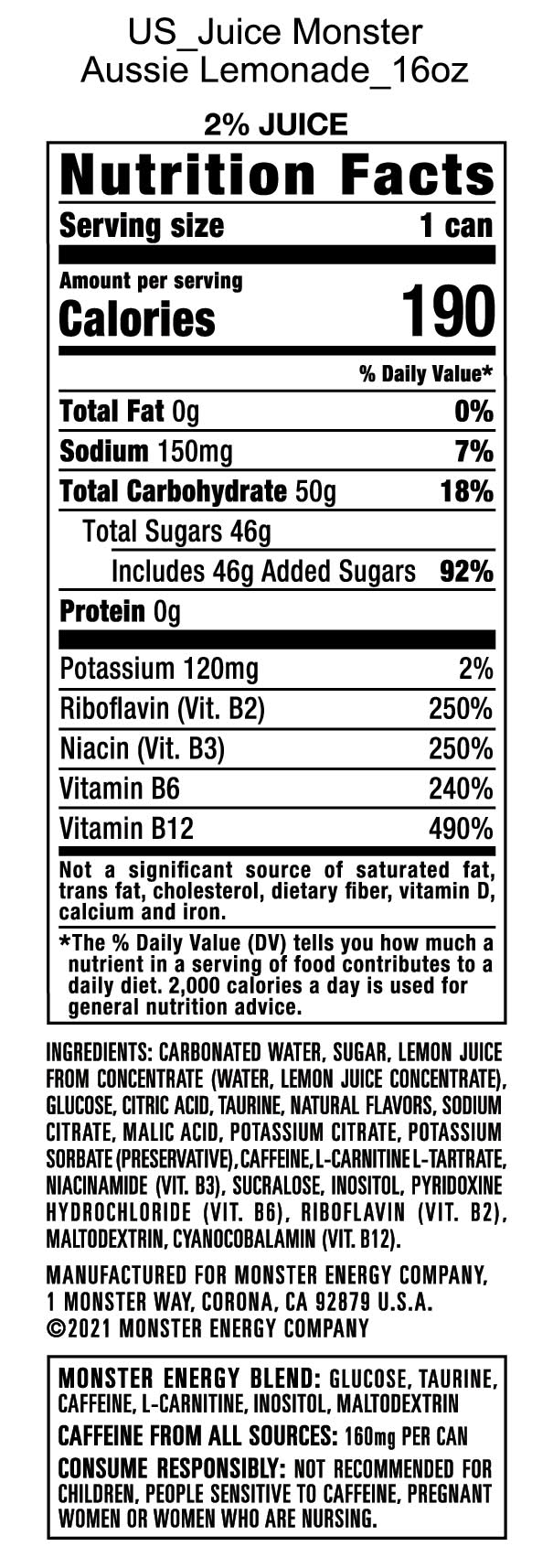 Monster Energy Blend: Glucose, Taurine, Caffeine, L-Carnitine, Inositol, Maltodextrin • Flavor: Aussie style lemonade • Pack size: 24 • Size: 24/16 OZ