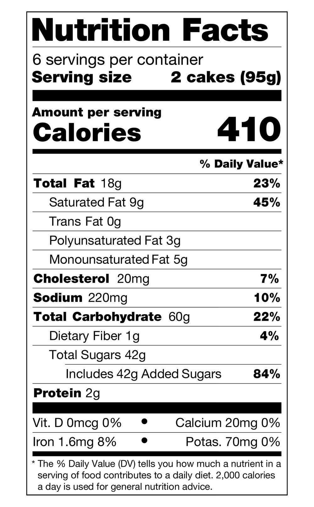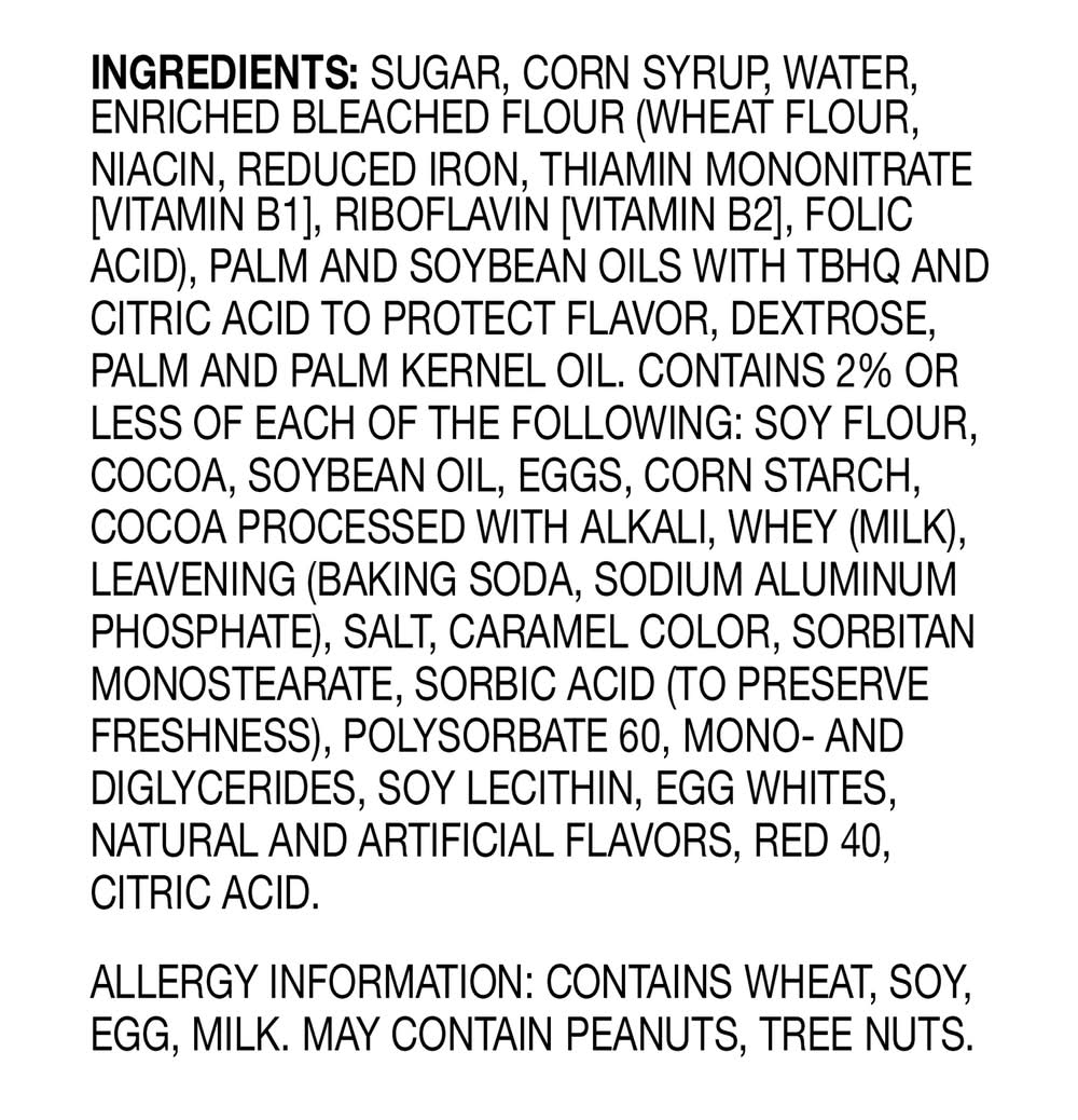 Ingredients: Sugar, Corn Syrup, Water, Enriched Bleached Flour (Wheat Flour, Niacin, Reduced Iron, Thiamin Mononitrate [Vitamin B1], Riboflavin [Vitamin B2], Folic Acid), Palm and Soybean Oils with TBHQ and Citric Acid to Protect Flavor, Dextrose, Palm and Palm Kernel Oil, Contains 2% or Less of Each of the Following: Soy Flour, Cocoa, Soybean Oil, Eggs, Corn Starch, Cocoa Processed with Alkali, Whey (Milk), Leavening (Baking Soda, Sodium Aluminum Phosphate), Salt, Caramel Color, Sorbitan Monostearate, Sorbic Acid (to Preserve Freshness), Polysorbate 60, Mono- and Diglycerides, Soy Lecithin, Egg Whites, Natural and Artificial Flavors, Red 40, Citric Acid Contains: Wheat, Soybeans, Eggs, Milk, Corn, Peanuts, Tree Nuts, Peanuts, Tree Nuts, Wheat, Soybeans, Eggs, Milk