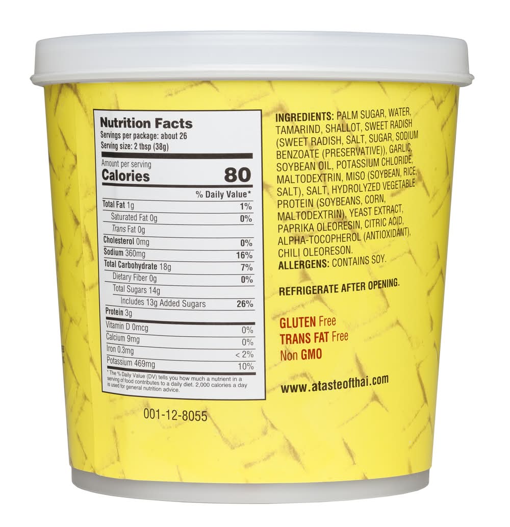 Ingredients: Palm Sugar, Water, Tamarind, Shallot, Sweet Radish (Sweet Radish, Salt, Sugar, Sodium Benzoate (Preservative)), Garlic, Soybean Oil, Potassium Chloride, Maltodextrin, Miso (Soybean, Rice, Salt), Hydrolyzed Vegetable Protein (Soybeans, Corn, Maltodextrin), Yeast Extract, Paprika Oleoresin, Citric Acid, Alpha-Tocopherol (Antioxidant), Chili Oleoresin Contains: Soybean and its Derivatives