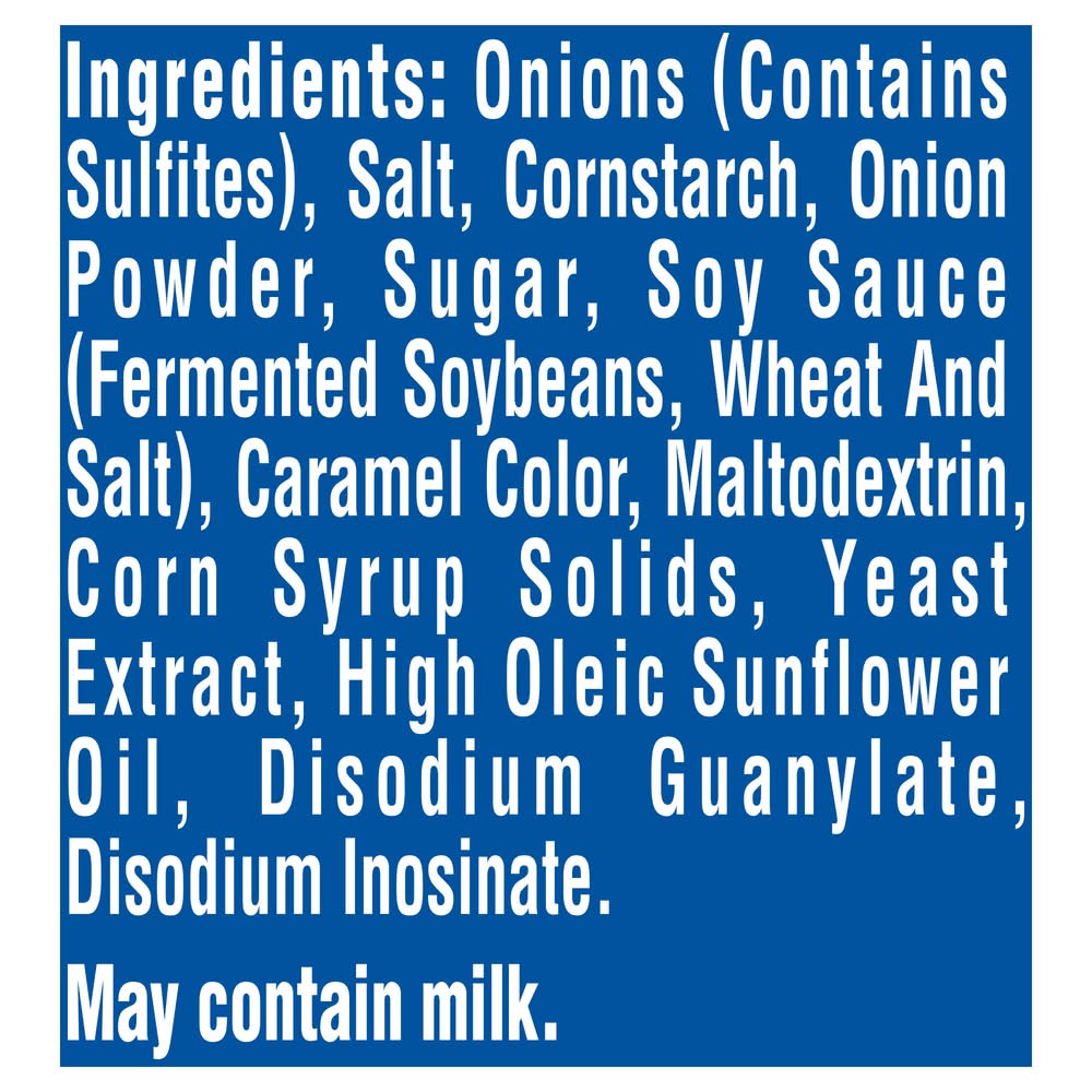 Ingredients: Onions Dehydrated, Salt, Corn Starch, Onion Powder, Sugar, Soy Sauce Fermented Soybeans, Wheat and Salt, Caramel Color Sulfites, Maltodextrin, Corn Syrup Dehydrated, Yeast Extract, High Oleic Sunflower Oil, Disodium Guanylate, Disodium Inosinate. Contains: Milk, Soybeans, Wheat