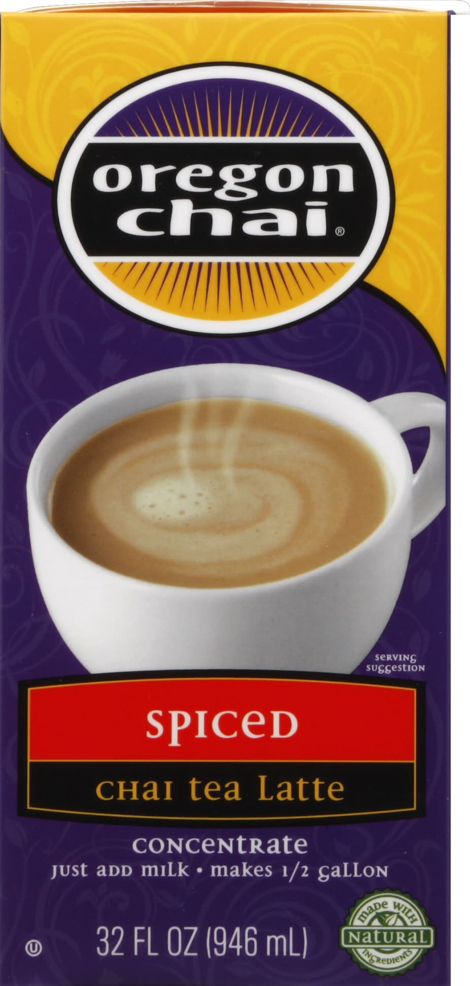 Just add milk. Makes 1/2 gallon. Made with natural ingredients. Our founder headed for the Himalayas in search of inspiration. And ta-da! She found chai - and was the very first to bring it back to the United States. Here at Oregon Chai, we believe in using only natural ingredients. Relax and enjoy the good karma in every delicious sip. Naturally, we're committed to sustainable agriculture and environmental awareness. Because when Mother Earth is happy, everyone's happy. For more info, visit oregonchai.com/earth. Please recycle. A more spirited version of The Original that's just as delicious. We've added more of the authentic chai spices for a bolder chai flavor. Enjoy it hot or cold and cozy up for a little me time. Oregon chai turns tea time into me time - and me time into we time. In the mood for delicious conversation and indulgent inspiration? Let's do chai. Have your people follow our people. If you're curious about Oregon Chai or have something you'd like to share with us directly, we invite you to visit oregonchai.com. For delicious breakfast, lunch, dinner and dessert recipes you can make with Oregon Chai, visit oregonchai.com. Gluten free. Tetra Pak: Tetra Brik Aseptic. • Flavor: Spiced • Size: 6 units