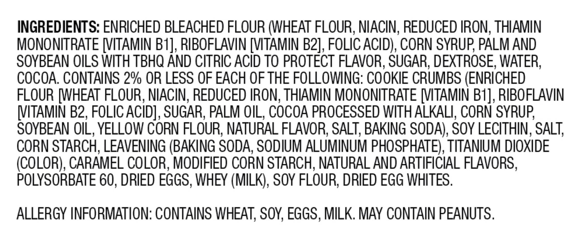 Ingredients: Enriched Bleached Flour (Wheat Flour, Niacin, Reduced Iron, Thiamin Mononitrate [Vitamin B1], Riboflavin [Vitamin B2], Folic Acid), Corn Syrup, Palm and Soybean Oils with TBHQ and Citric Acid to Protect Flavor, Sugar, Dextrose, Water, Cocoa, Contains 2% or Less of Each of the Following: Cookie Crumbs (Enriched Flour [Wheat Flour, Niacin, Reduced Iron, Thiamin Mononitrate [Vitamin B1], Riboflavin [Vitamin B2, Folic Acid], Sugar, Palm Oil, Cocoa Processed with Alkali, Corn Syrup, Soybean Oil, Yellow Corn Flour, Natural Flavor, Salt, Baking Soda), Soy Lecithin, Salt, Corn Starch, Leavening (Baking Soda, Sodium Aluminum Phosphate), Titanium Dioxide (Color), Caramel Color, Modified Corn Starch, Natural and Artificial Flavors, Polysorbate 60, Dried Eggs, Whey (Milk), Soy Flour, Dried Egg Whites Contains: Wheat, Soybeans, Eggs, Milk, Peanuts