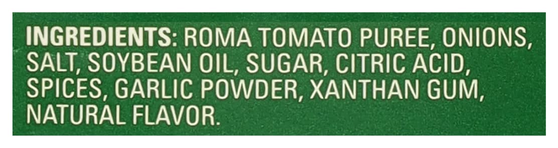 Ingredients: Roma Tomato Puree, Onions, Salt, Soybean Oil, Sugar, Citric Acid, Spices, Garlic Powder, Xanthan Gum, Natural Flavor Contains: Soybeans