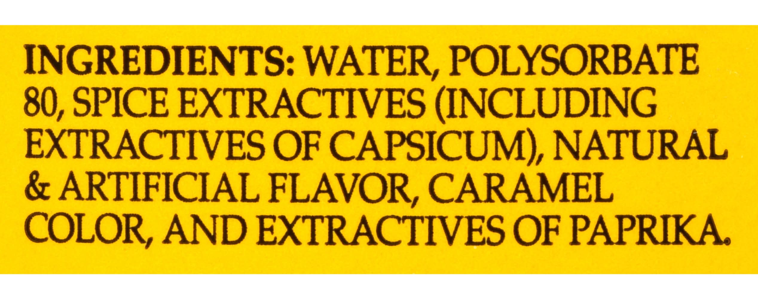 Ingredients: Water, Polysorbate 80, Spice Extractives (Including Extractives of Capsicum), Natural Artificial Flavor, Caramel Color, and Extractives of Paprika.