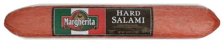 Margherita Hard Salami Stick (24 oz) is a blend of pork and beef, featuring a smoked robust flavor. This cured meat is slow-aged and packed in a snack size for convenience. Size: 9 units