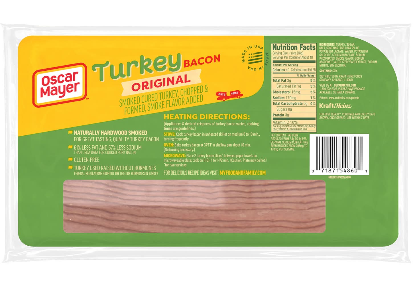 Everything is better with turkey bacon. Bacon smoked cured turkey, chopped & formed, smoke flavor added has 58% less fat and 57% less sodium than usda data for cooked pork bacon without sacrificing the flavor you crave. Our turkey bacon that is raised without hormones* minimizes prep time, making it easier to create delicious meals in a hurry. Heat our turkey bacon on the stove, in the oven or microwave to your desired crispness. Taste the natural hardwood smoke flavor that makes oscar mayer turkey bacon the perfect addition to breakfast sandwiches and blts. Enjoy turkey bacon with eggs, try it as a savory salad topping or add some slices to your next turkey burger. Discover the endless possibilities of turkey bacon. Size: 16 units