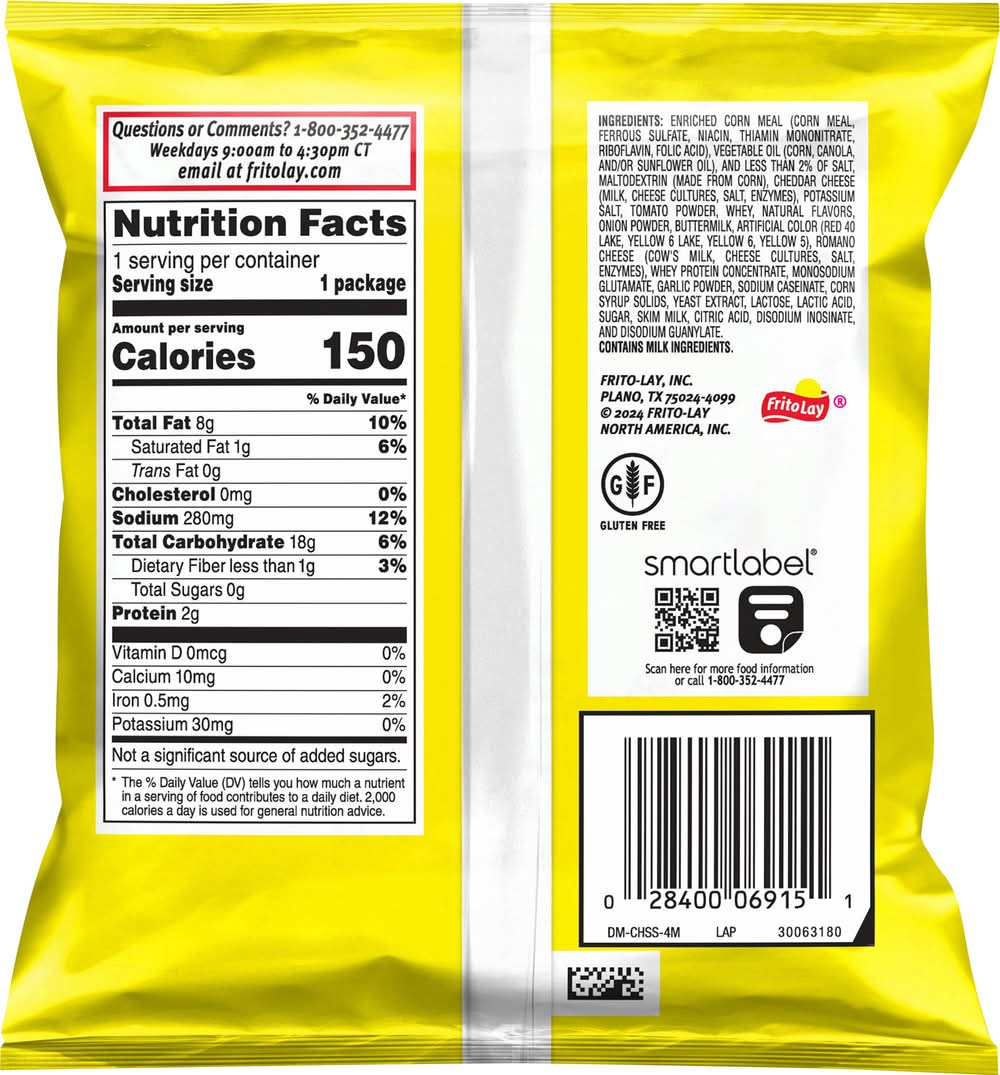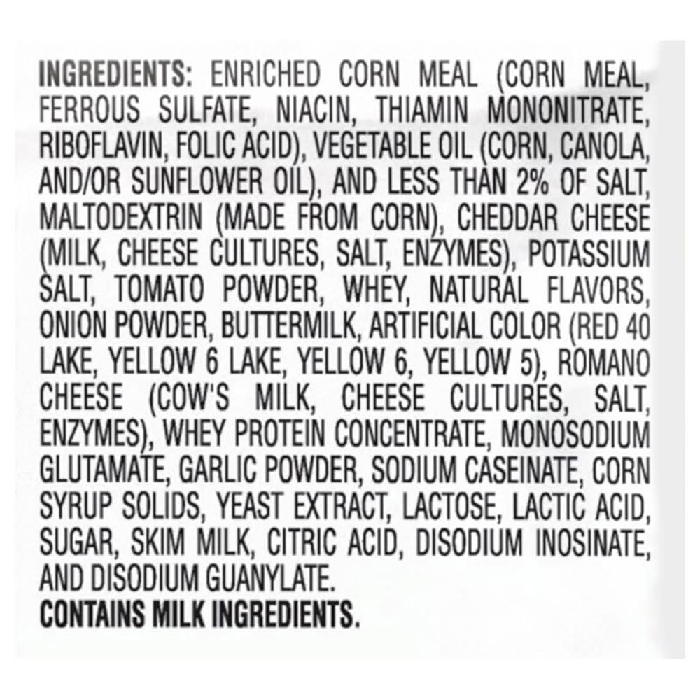 Ingredients: Enriched Corn Meal (Corn Meal, Ferrous Sulfate, Niacin, Thiamin Mononitrate, Riboflavin, Folic Acid), Vegetable Oil (Corn, Canola, and/or Sunflower Oil), and Less than 2% of Salt, Maltodextrin (Made from Corn), Cheddar Cheese (Milk, Cheese Cultures, Salt, Enzymes), Potassium Salt, Tomato Powder, Whey, Natural Flavors, Onion Powder, Buttermilk, Artificial Color (Red 40 Lake, Yellow 6 Lake, Yellow 6, Yellow 5), Romano Cheese (Cow's Milk, Cheese Cultures, Salt, Enzymes), Whey Protein Concentrate, Monosodium Glutamate, Garlic Powder, Sodium Caseinate, Corn Syrup Solids, Yeast Extract, Lactose, Lactic Acid, Sugar, Skim Milk, Citric Acid, Disodium Inosinate, and Disodium Guanylate Contains: Milk, Lactose