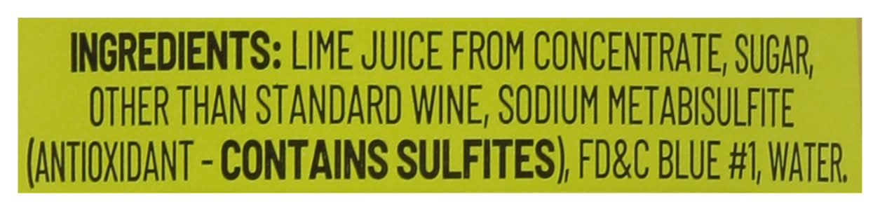 Ingredients: Lime Juice from Concentrate, Sugar, Other than Standard Wine, Sodium Metabisulfite (Antioxidant – Contains Sulfites), FD&C Blue 1, Water Contains: Sulfites