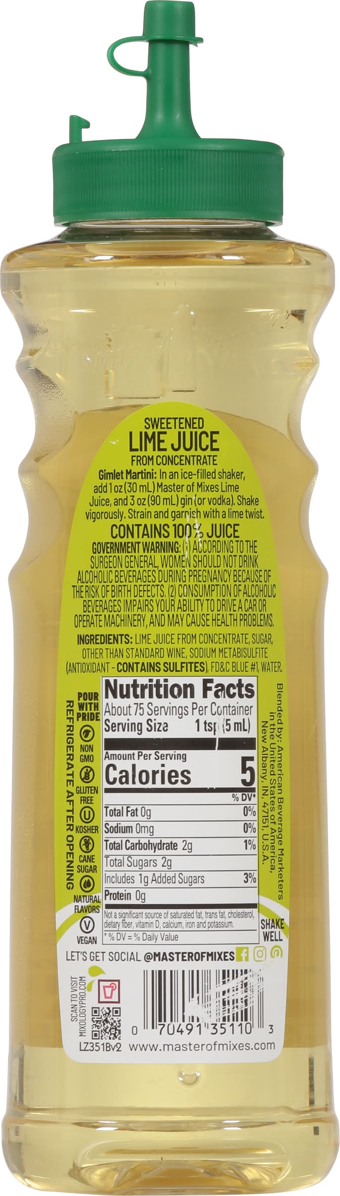 Cocktail Essentials, Sweetened, Lime Juice • Brand: Master of mixes • gluten-free, kosher, vegan, GMO-free
