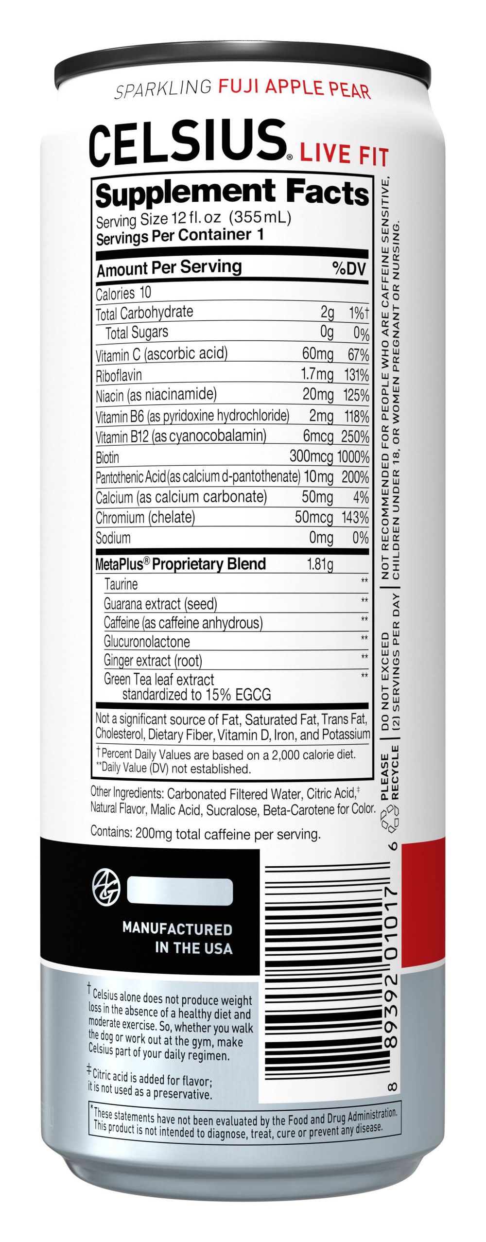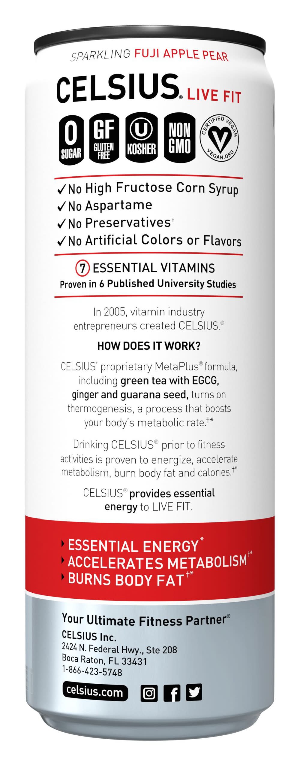 Essential energy. Accelerates metabolism helps maintain the body's regular metabolic function alone does not produce weight loss in the absence of a healthy diet and moderate exercise. So, whether you walk the dog or work out at the gym, make this as a part of your daily regimen. Burns body fat helps maintain the body's regular metabolic function. It alone does not produce weight loss in the absence of a healthy diet and moderate exercise. So, whether you walk the dog or work out at the gym. No high fructose corn syrup. No aspartame. No artificial color. 7 essential vitamins. Proven in 6 published university studies. In 2005, vitamin industry entrepreneurs created.How does it works? Proprietary metaplus formula, including green tea with egcg, ginger and guarana seed, turns on thermogenesis, a process that boosts your body's metabolic rate. Drinking prior to fitness activities is proven to energize, accelerate metabolism, burn body fat and calories. Provides essential energy to live fit. • Brand: Celsius • Flavor: Fuji apple pear • Celsius Inc., 2424 N Federal Hwy, Ste 208,Boca Raton, FL. • Packaging: Reusable