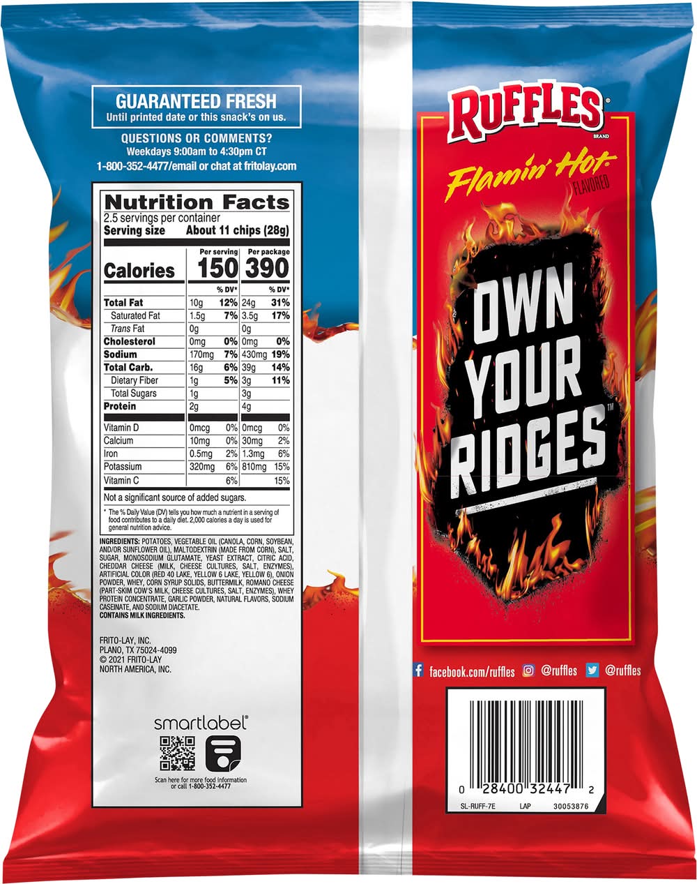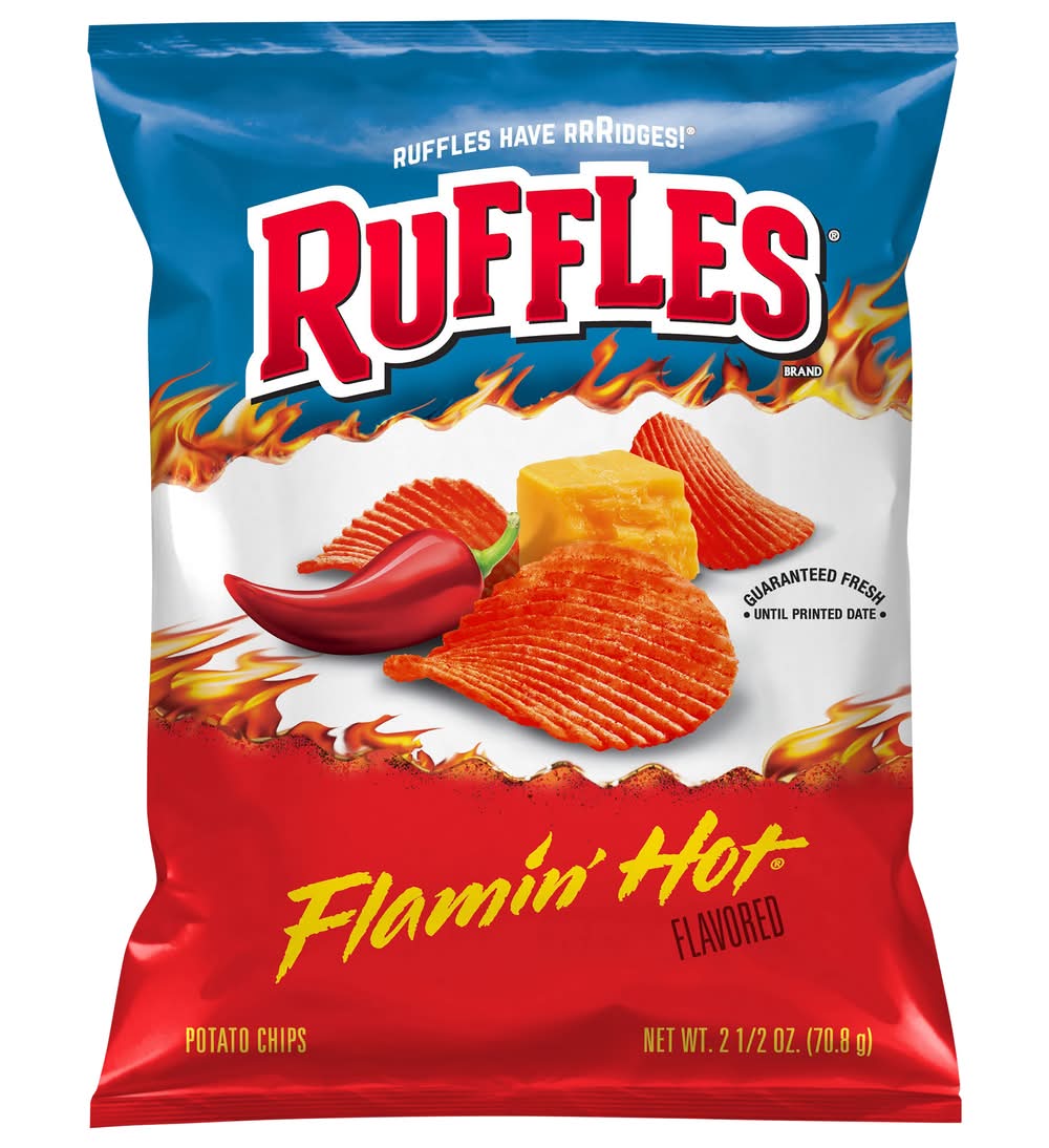 With crunchy ridges made to stand up to even the thickest dips, RUFFLES potato chips bring epic flavor and snack satisfaction to any get-together. • Brand: Ruffles • Flavor: Flamin’ hot
