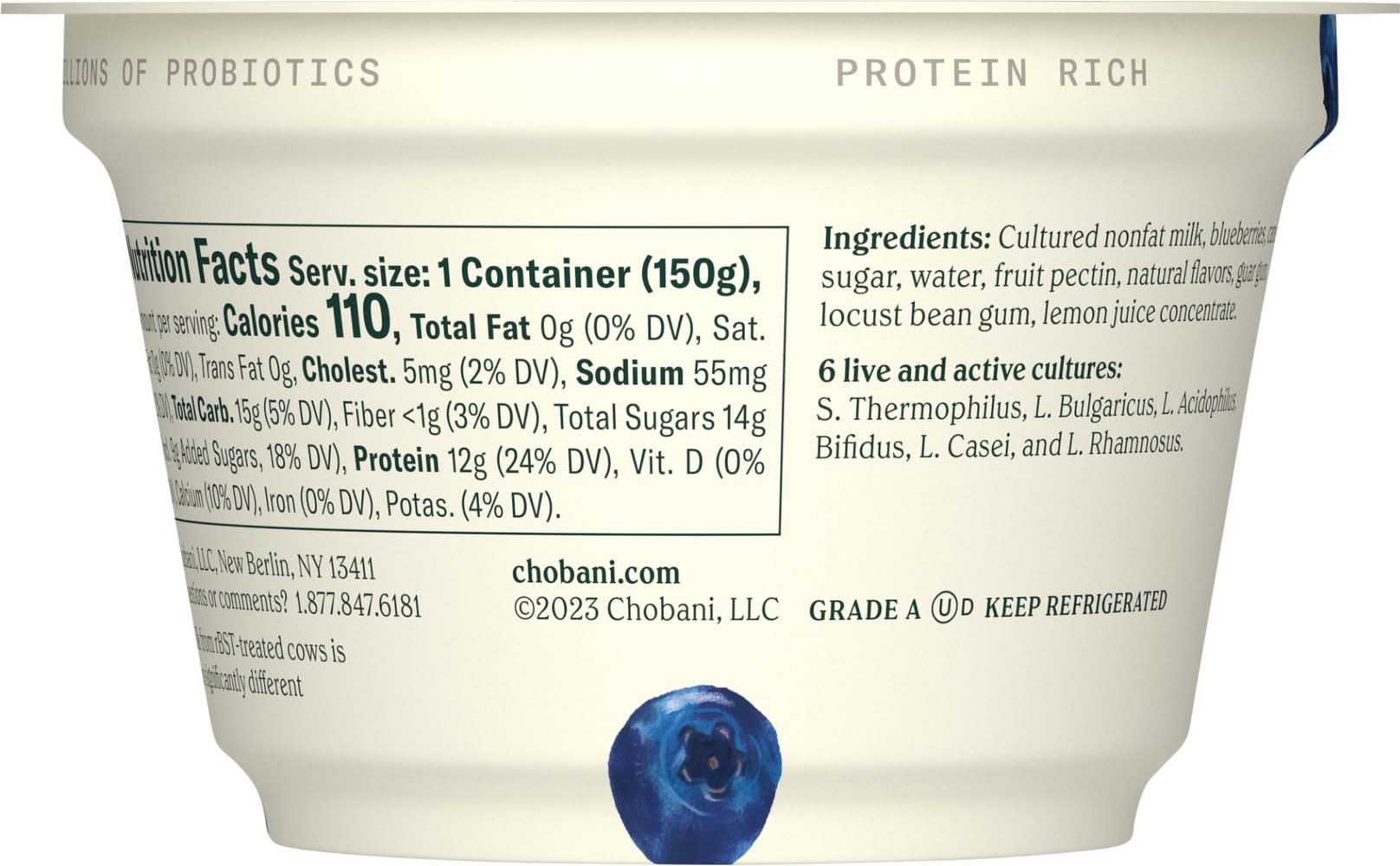 No artificial flavors. Nonfat. No gluten. 0% milkfat. Billions of probiotics. Protein rich. Authentically crafted. No fake fruit. No artificial sweeteners. No preservatives. No rBST (Milk from rBST-treated cows is not significantly different). Grade A. • Brand: Chobani • Flavor: Blueberry • gluten-free, kosher • Chobani, LLC, New Berlin, NY 13411,