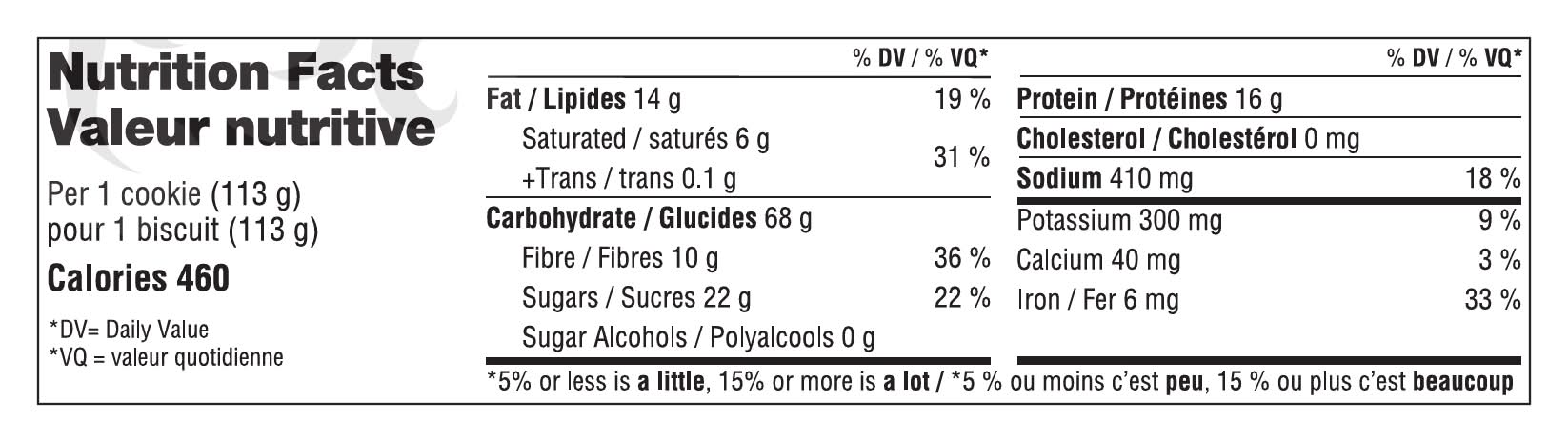 Ingredients: Enriched Flour, Protein Blend (Vital Wheat Gluten, Pea Protein, Rice Protein), Inulin, Sugars (Cane Sugar, Invert Sugar), Semi-Sweet Chocolate Chips (Unsweetened Chocolate, Sugar, Cocoa Butter, Dextrose, Natural Vanilla Extract), Palm Fruit Oil, Vegetable Glycerin, Cocoa (Processed with Alkali), Sunflower Lecithin or Canola Lecithin, Natural Flavour, Baking Soda, Salt, Xanthan Gum, Guar Gum Contains: Wheat, Gluten, Peanuts, Tree Nuts, Soybeans, Milk, Eggs