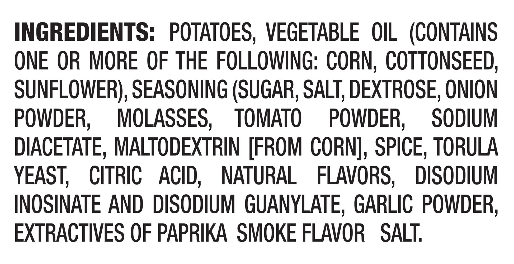 Ingredients: Potatoes, Vegetable Oil (Contains One or More of the Following: Corn, Cottonseed, Sunflower), Seasoning (Sugar, Salt, Dextrose, Onion Powder, Molasses, Tomato Powder, Sodium Diacetate, Maltodextrin [from Corn], Spice, Torula Yeast, Citric Acid, Natural Flavors, Disodium Inosinate and Disodium Guanylate, Garlic Powder, Extractives of Paprika, Smoke Flavor), Salt Contains: Corn