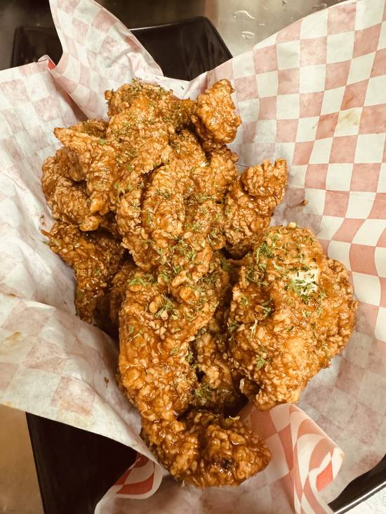 14 pieces of chicken marinated in garlic and soy for a savory, aromatic experience. "" Tikkudak mean : Fried and then bake again""