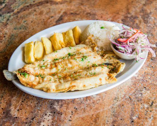 Fried trout served with fried yuca, white rice, and fresh sarsa criolla.