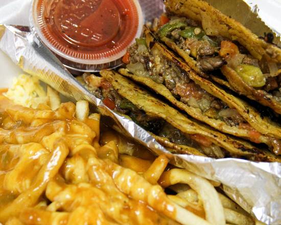 3 Grilled tacos with choice of meat. Onions, tomatoes, jalapeno and cheese inside. Side of chili cheese fries.