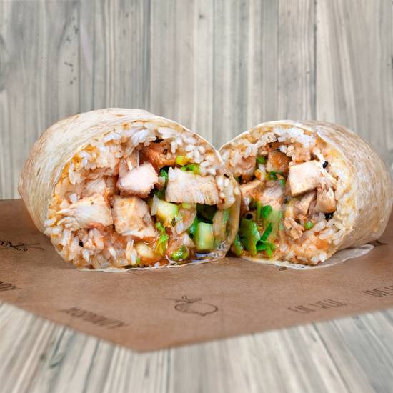 (RV) Chicken breast, sriracha-chipotle-mayo, sticky rice, furikake, kimchi, gochujang, cucumber, cilantro, green onion. With steak, add $1.50